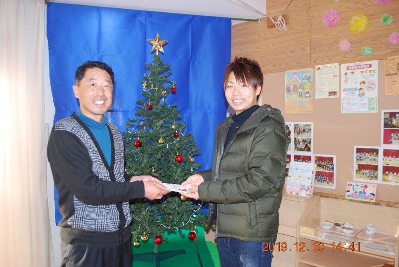 令和元年12月11日、パフォーマーたつみ氏が園を訪れ寄附金を手渡して下さいました。たつみ氏は尾花沢市出身の大道芸人で、本業(会社員)の傍ら県内全域で活動・ご活躍されています。十年来、保育園や幼稚園などへの寄附を継続、積極的に福祉活動をなさっておいでです。 今年度は村山市、河北町を含む3市町を検討の結果、村山市戸沢保育園、かほくあいこども園と偶然にも当会の2園にお声掛け頂きました。寄附金はたつみ氏の意向で、遊具購入のために大切に使わせていただきます。ありがとうございました。 水野理事長が駆け付け記念撮影 かほくあいこども園にて八矢園長に 贈呈されました 戸沢保育園にて井上園長に贈呈されました