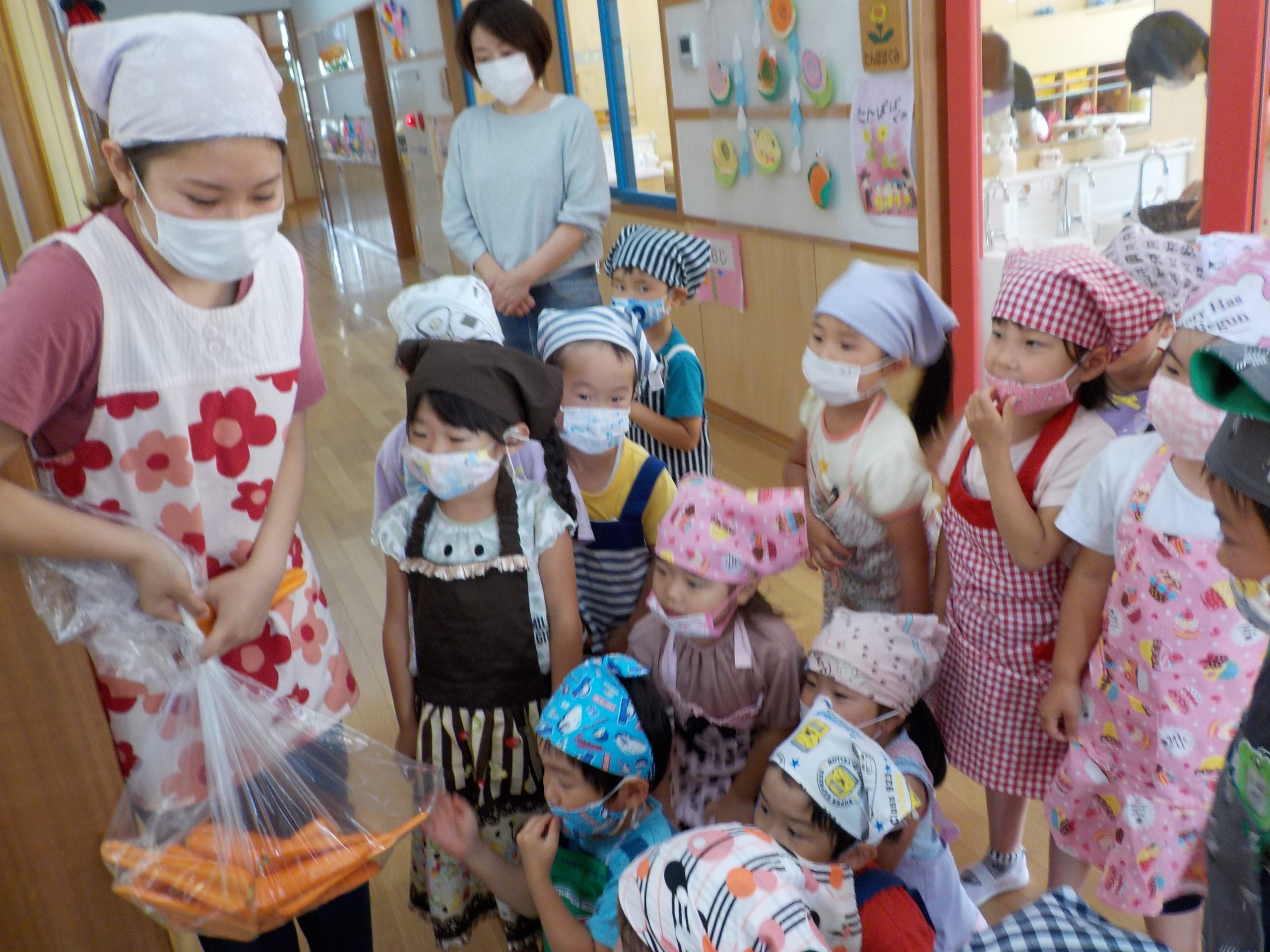 4歳児たんぽぽ組の子どもたちが、にんじんの皮むきのお手伝いをしました。