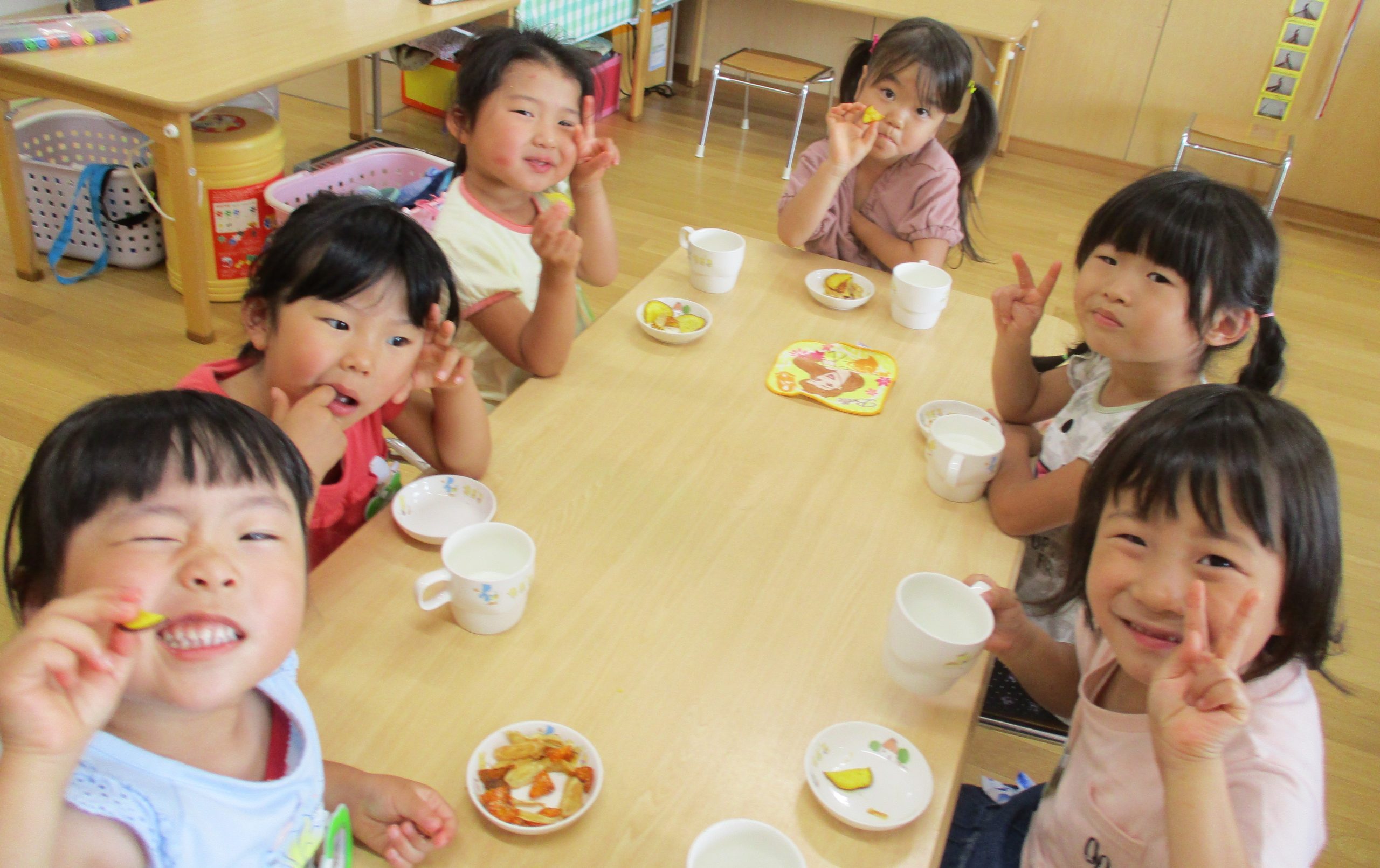 「美味しいおやつにしてください。」「はいわかりました。みんな上手に皮をむいてくれましたね。ありがとう。」と給食の先生にも褒められました。