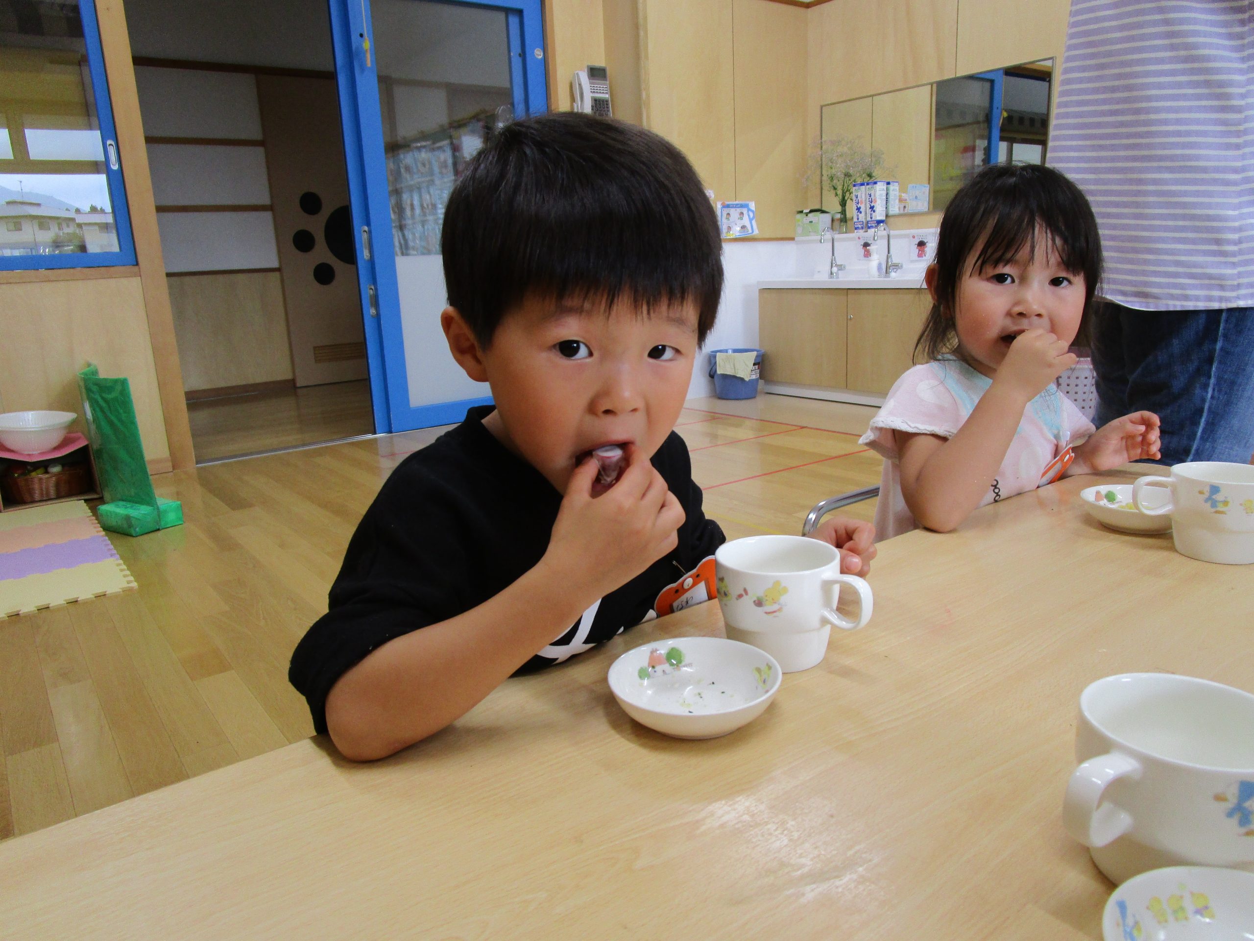 採り立ての「はつか大根」を給食の先生にサラダにしてもらい、おやつの時間にみんなでたべました。