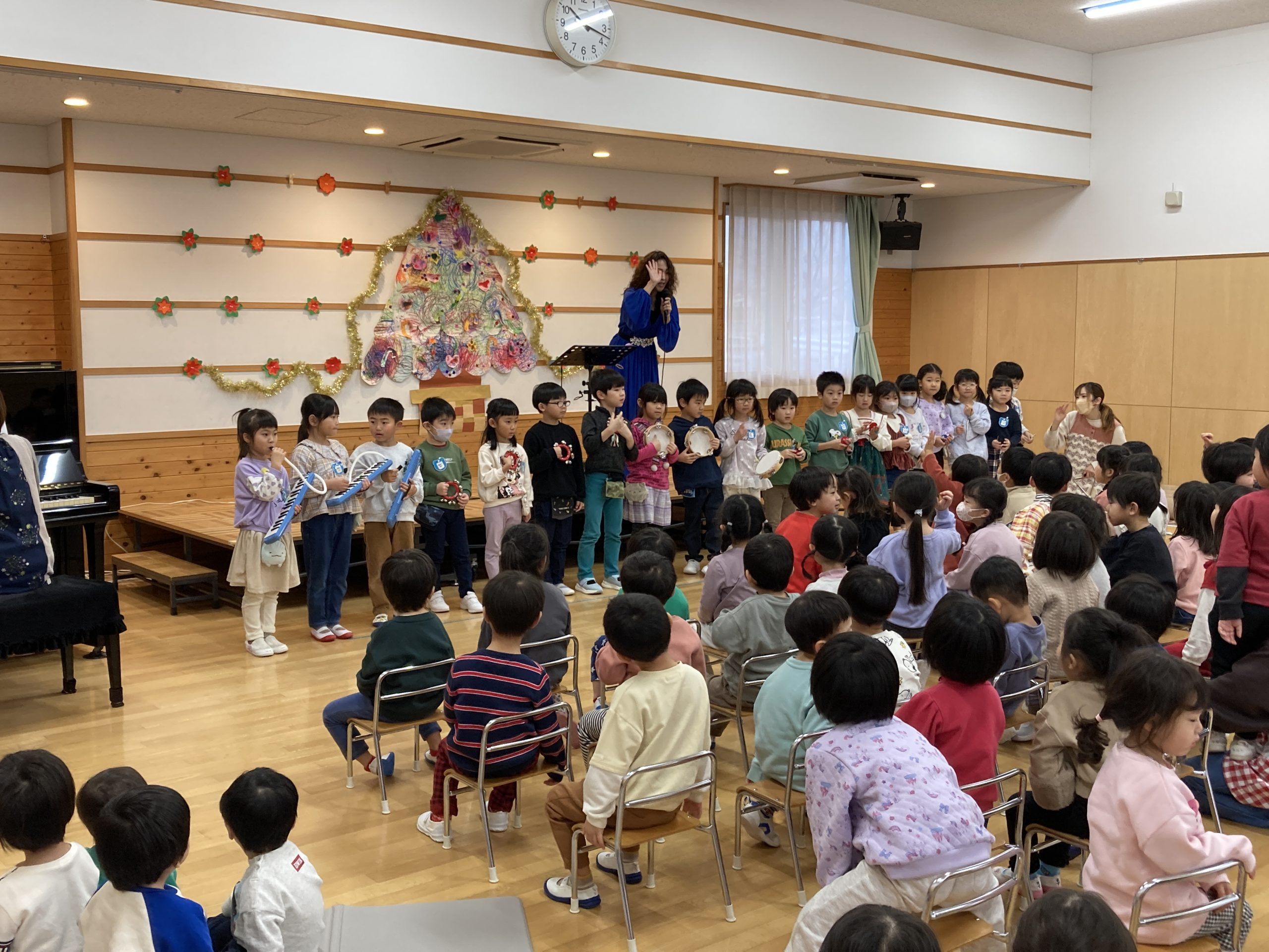 「やまのおんがくか」をシーナさんが歌い、年長児が楽器で華を添えました☆
