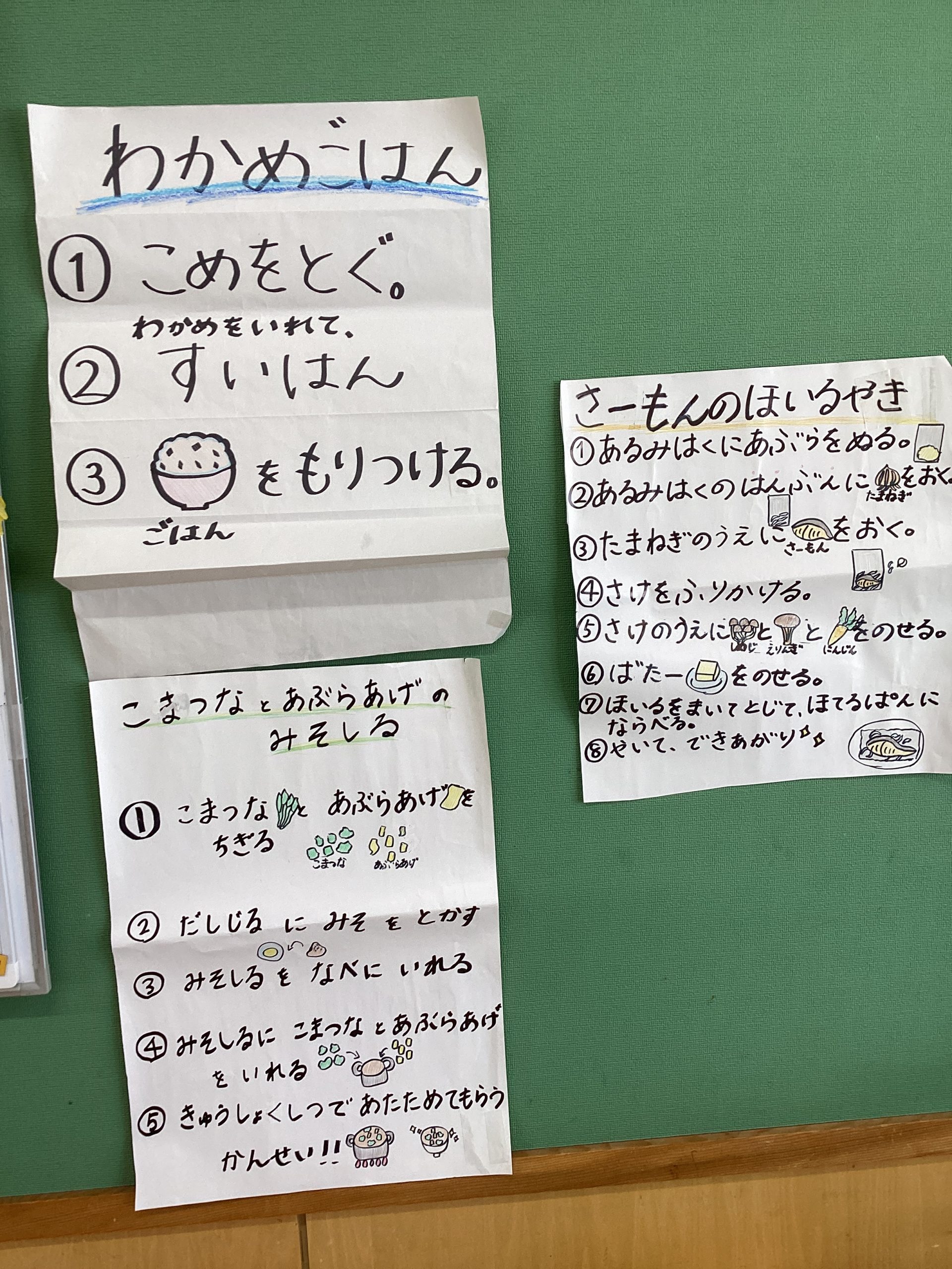 メニューは、わかめごはん、小松菜と油揚げのみそ汁、サーモンのホイル焼きです。