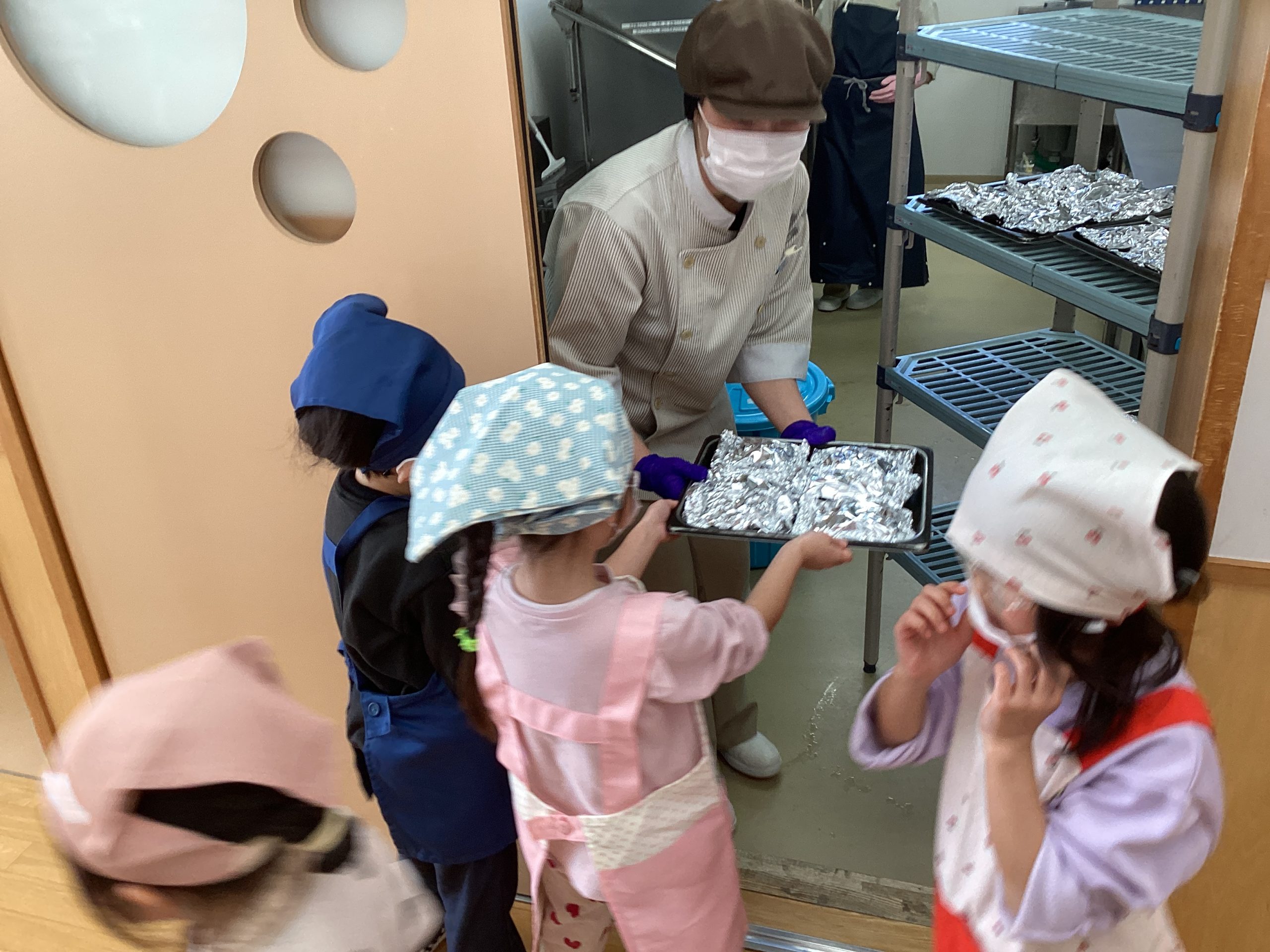 ホテルパンに乗せて、給食室に持っていき焼いてもらいます。