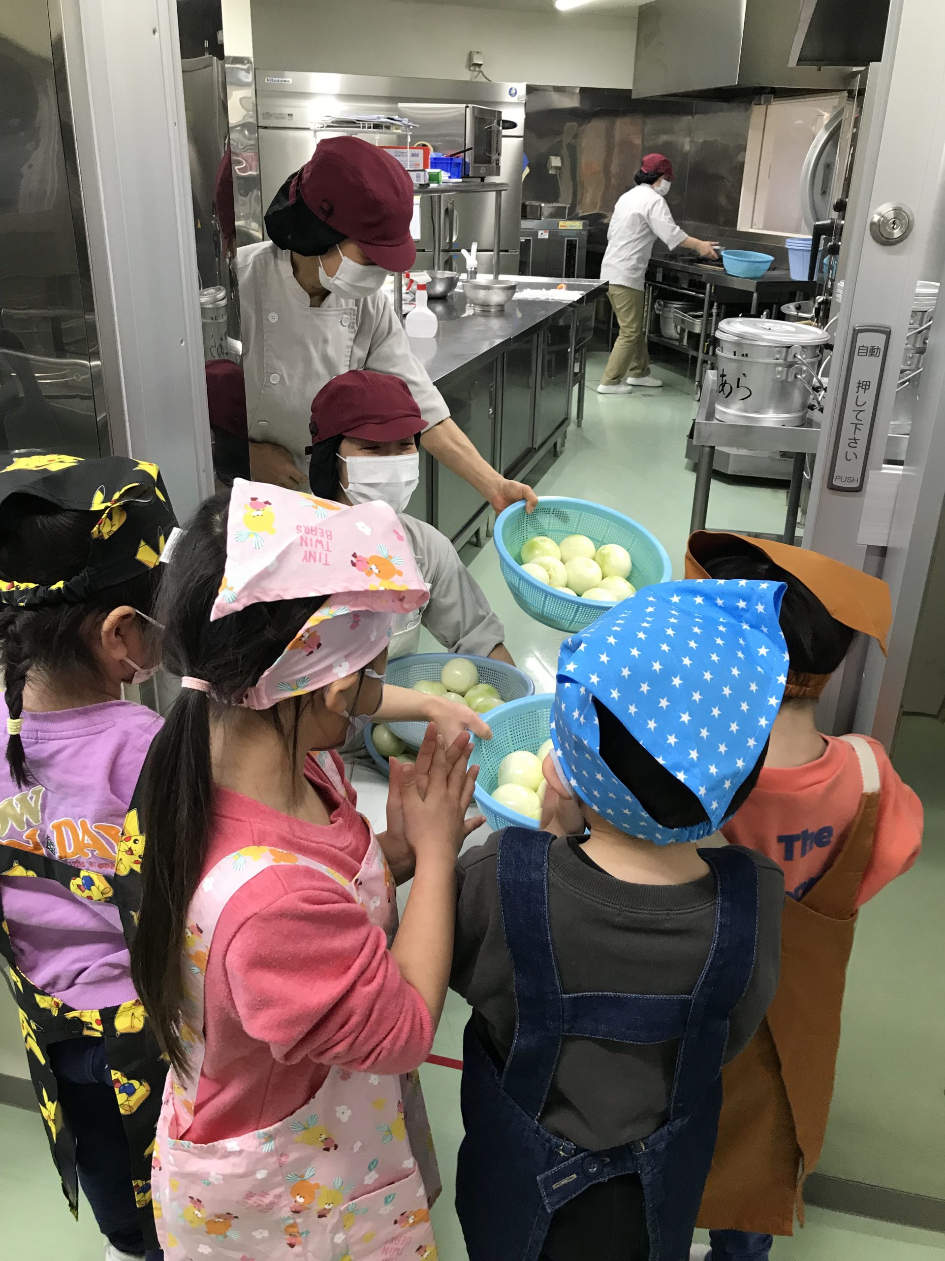 全部むけたら、お当番さんが給食室へ配達に。