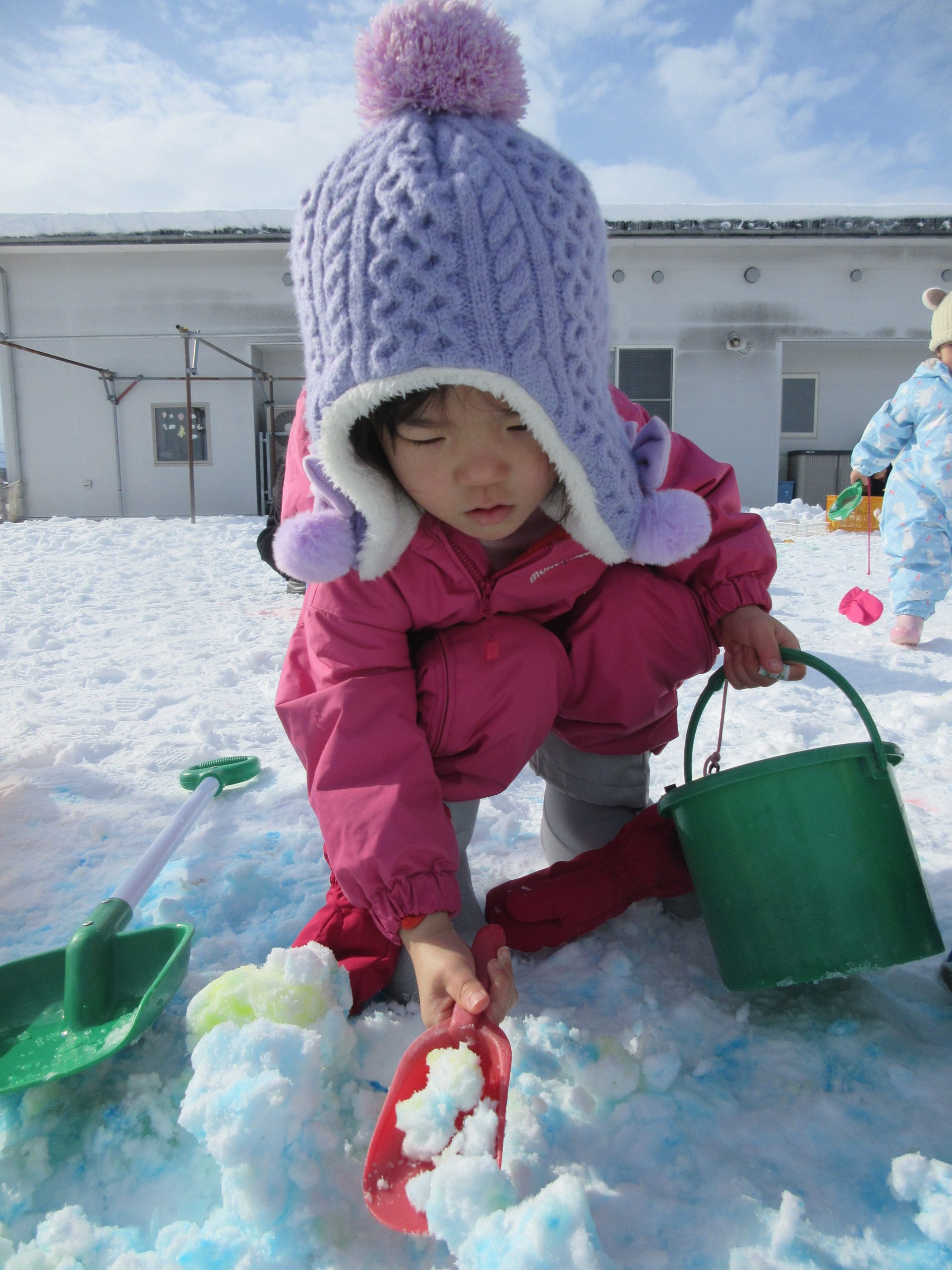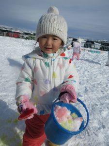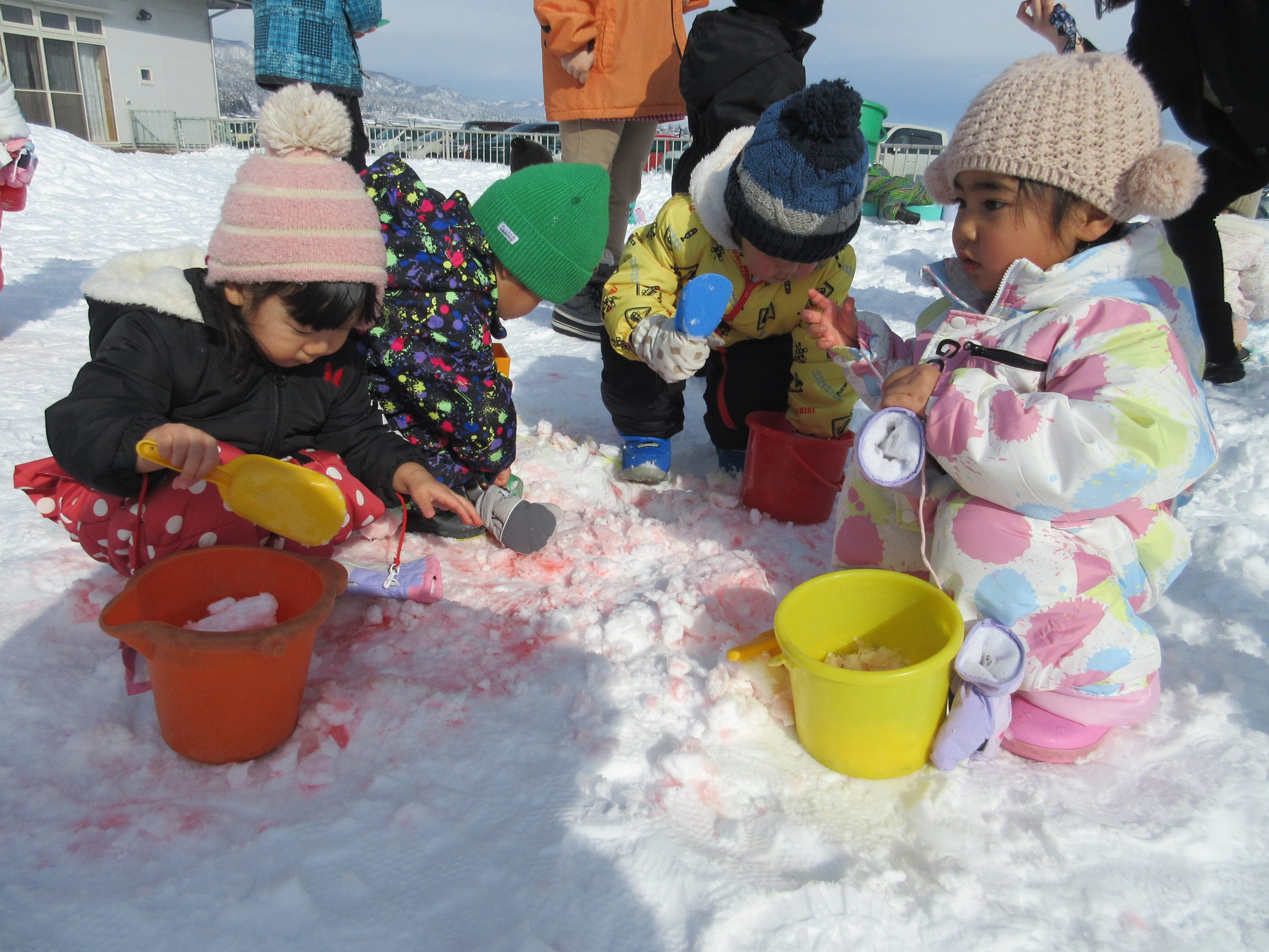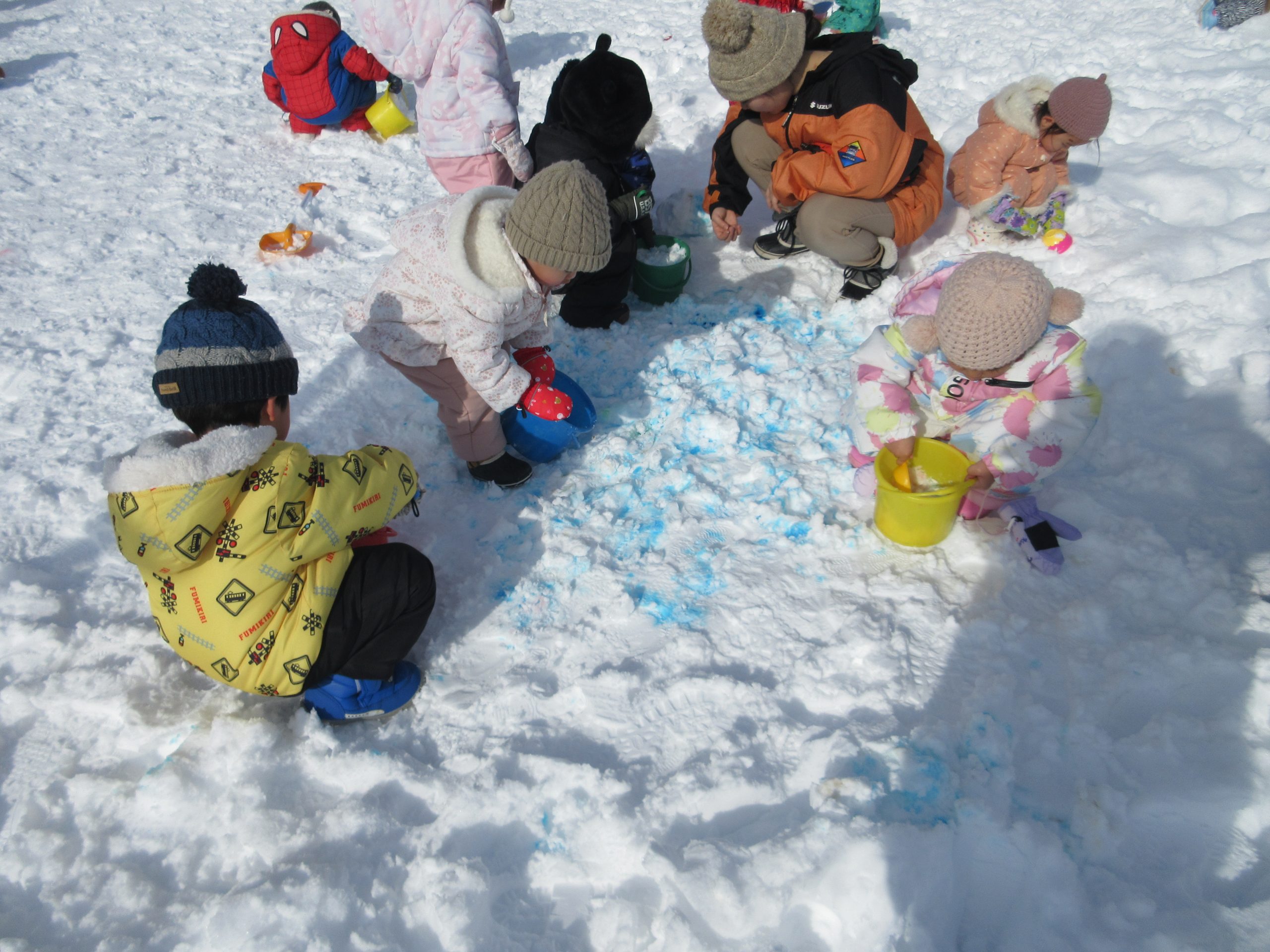 この日は、食紅を使って、雪の上に保育者がピンクやみずいろの色を付けると~