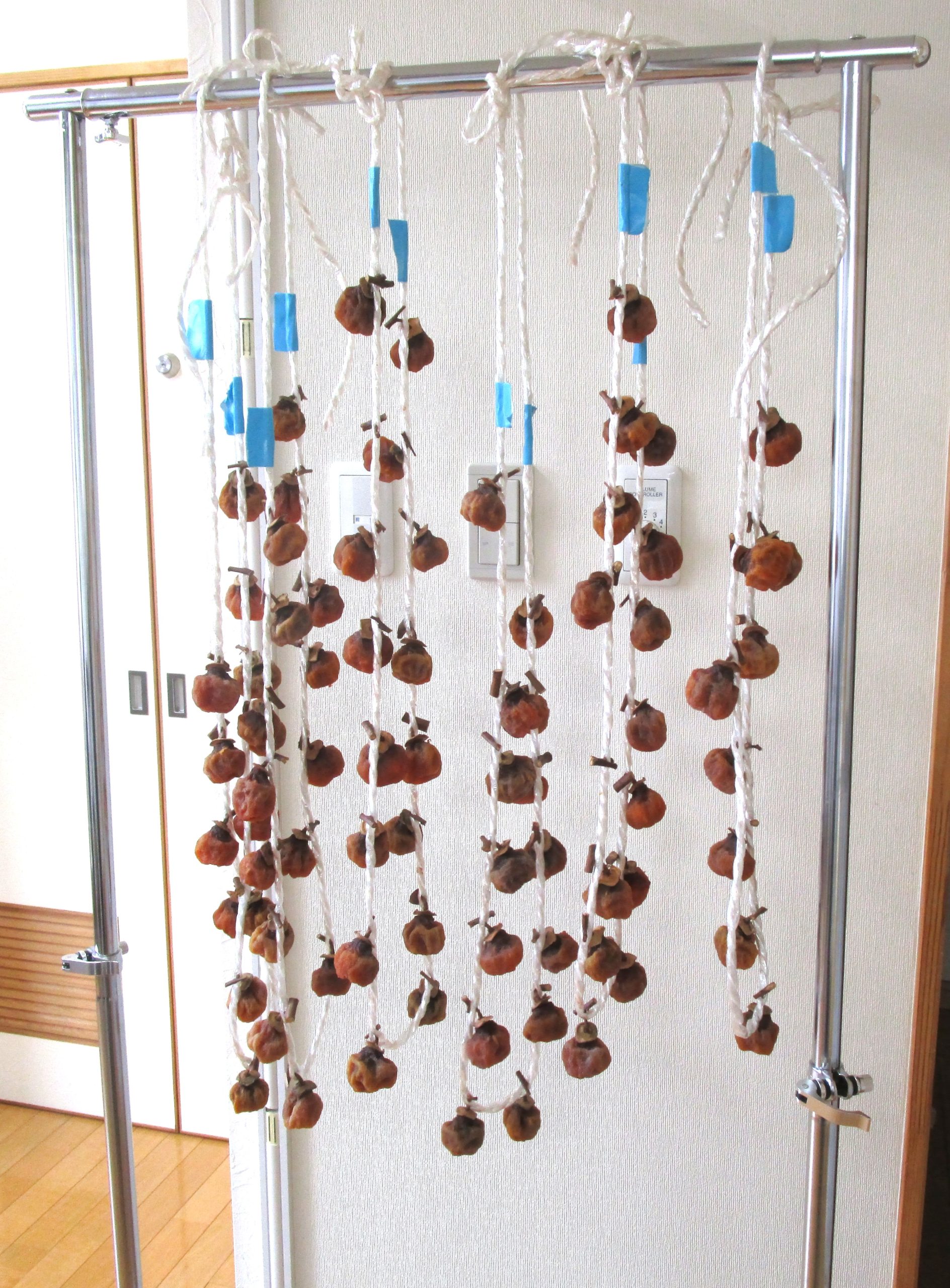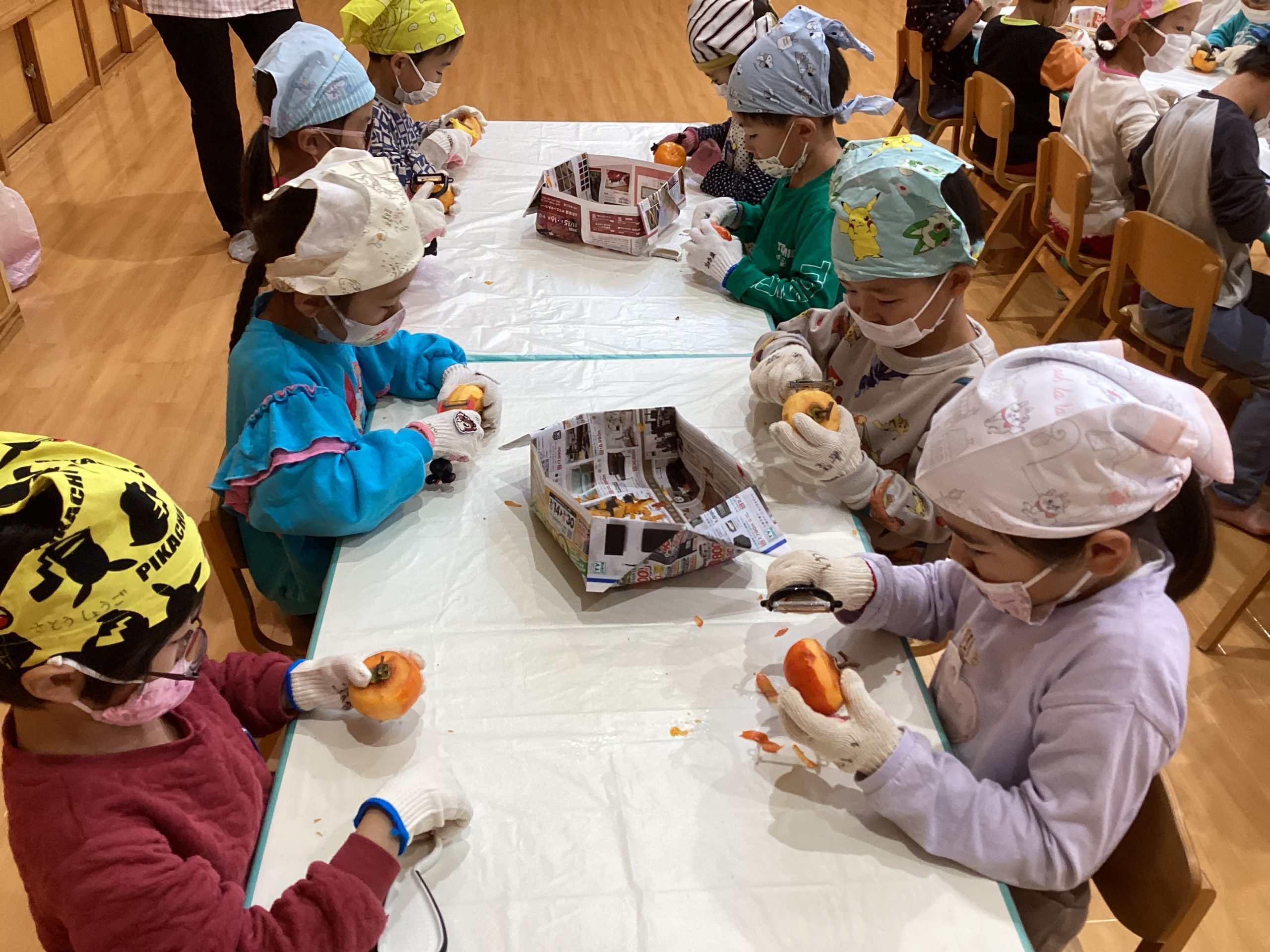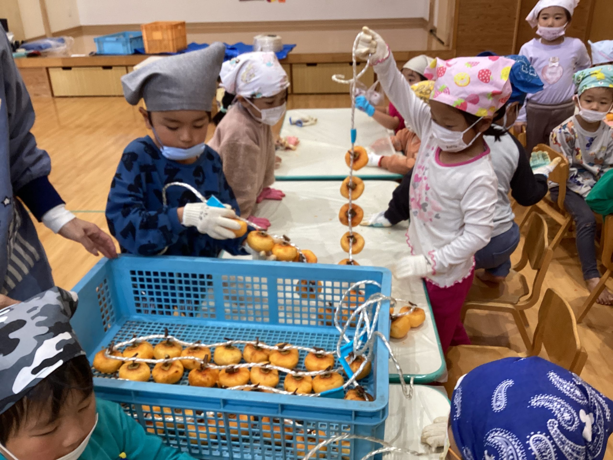 干し柿を作っている地域の方から作り方を教えてもらいました。ピーラーで皮を剥き、ロープ状の紐にへたの所をひっかけていきます。初めてピーラーを使う子も多かったのですが、丁寧に、慎重に皮を剥き、とても上手に剥いていました。