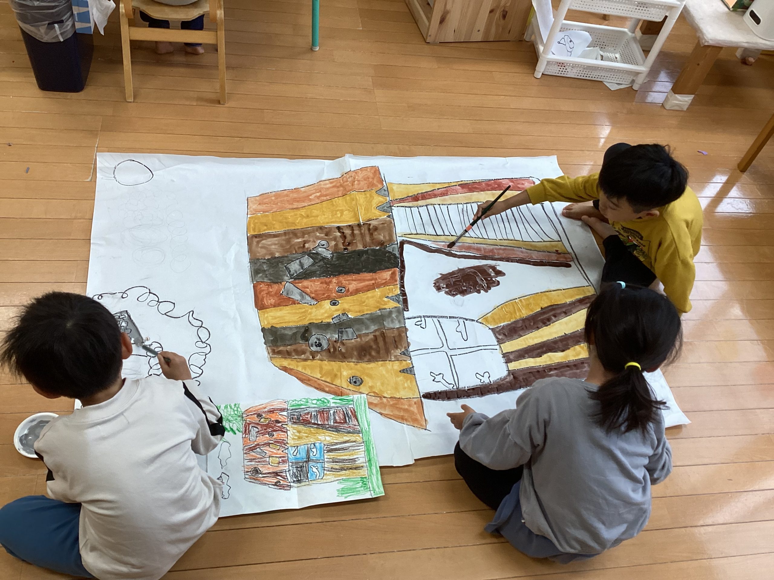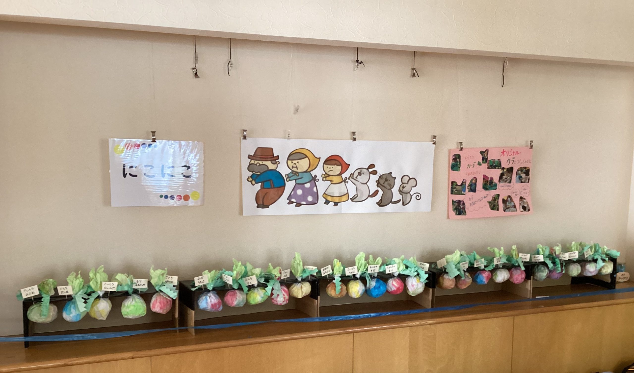 春から沢山の野菜や植物の種を蒔いてお世話や収穫を楽しんだきらきら組さんは、『ジャックとまめのき』のお話をもとにした創作劇を発表しました。背景画や小道具作りなども、みんなの手作りです。