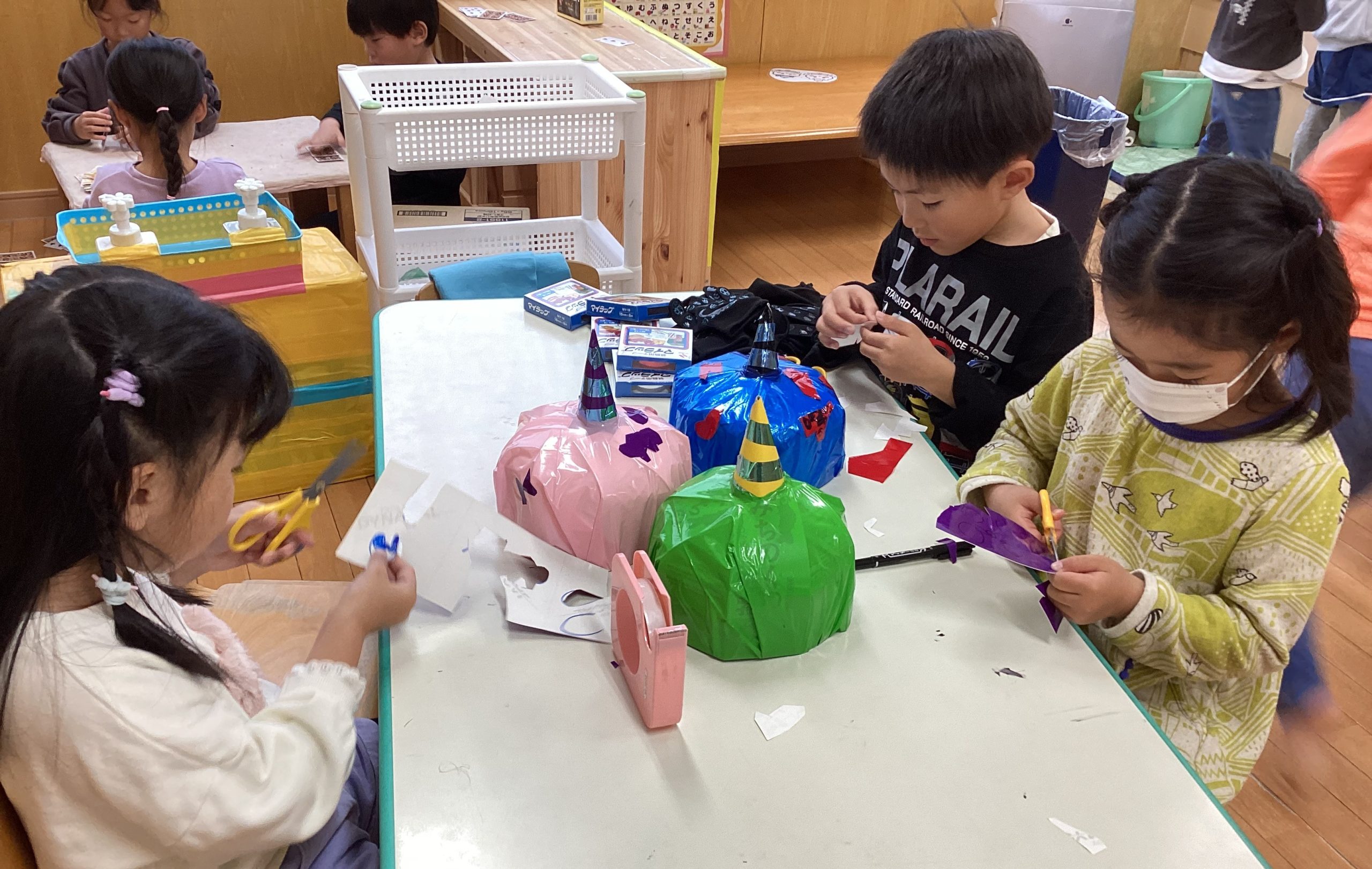 鬼役の子ども達は、自分で鬼の帽子を飾りつけ。世界に一つだけの鬼の帽子を作りました。