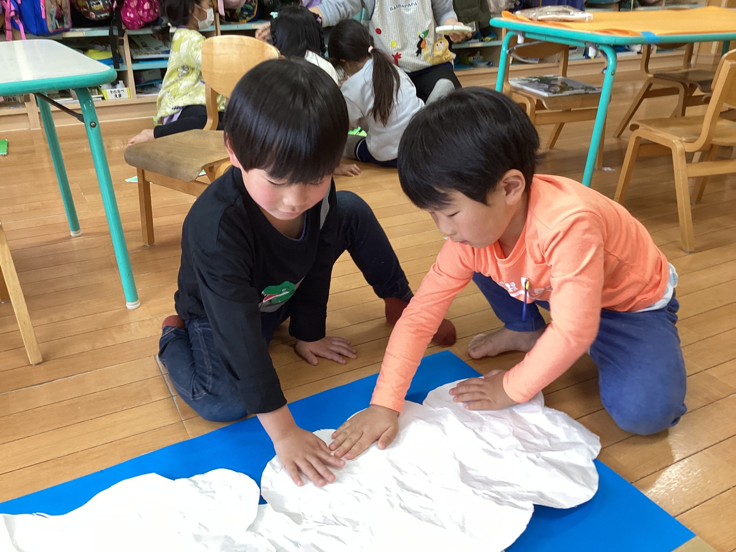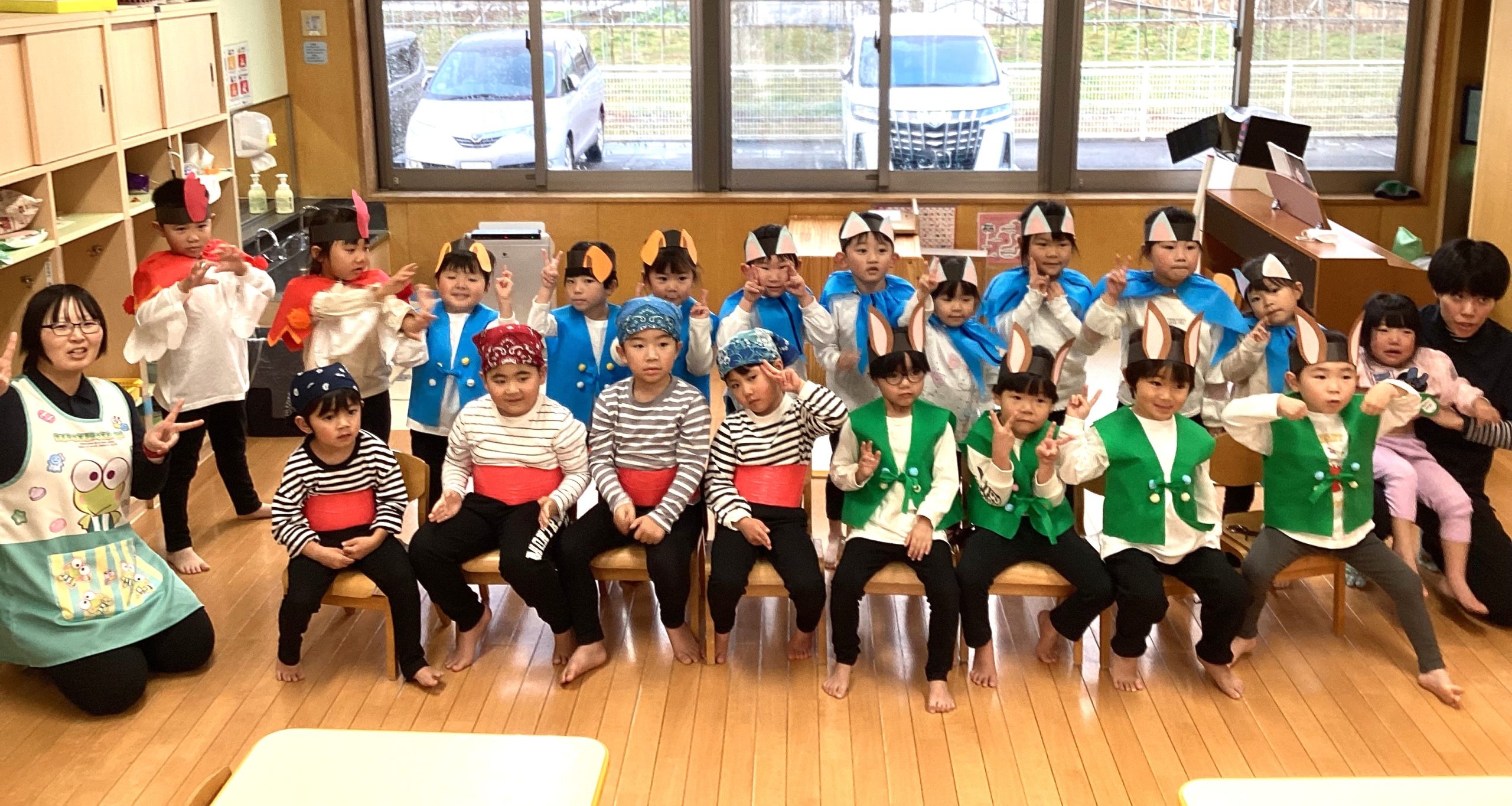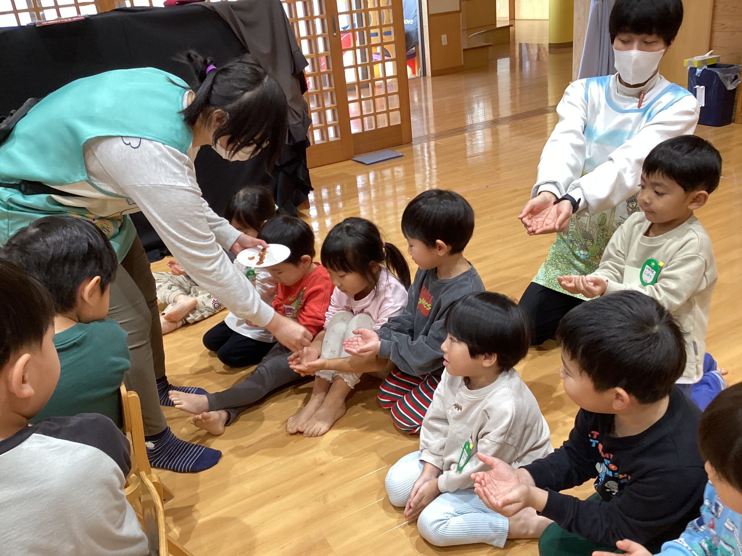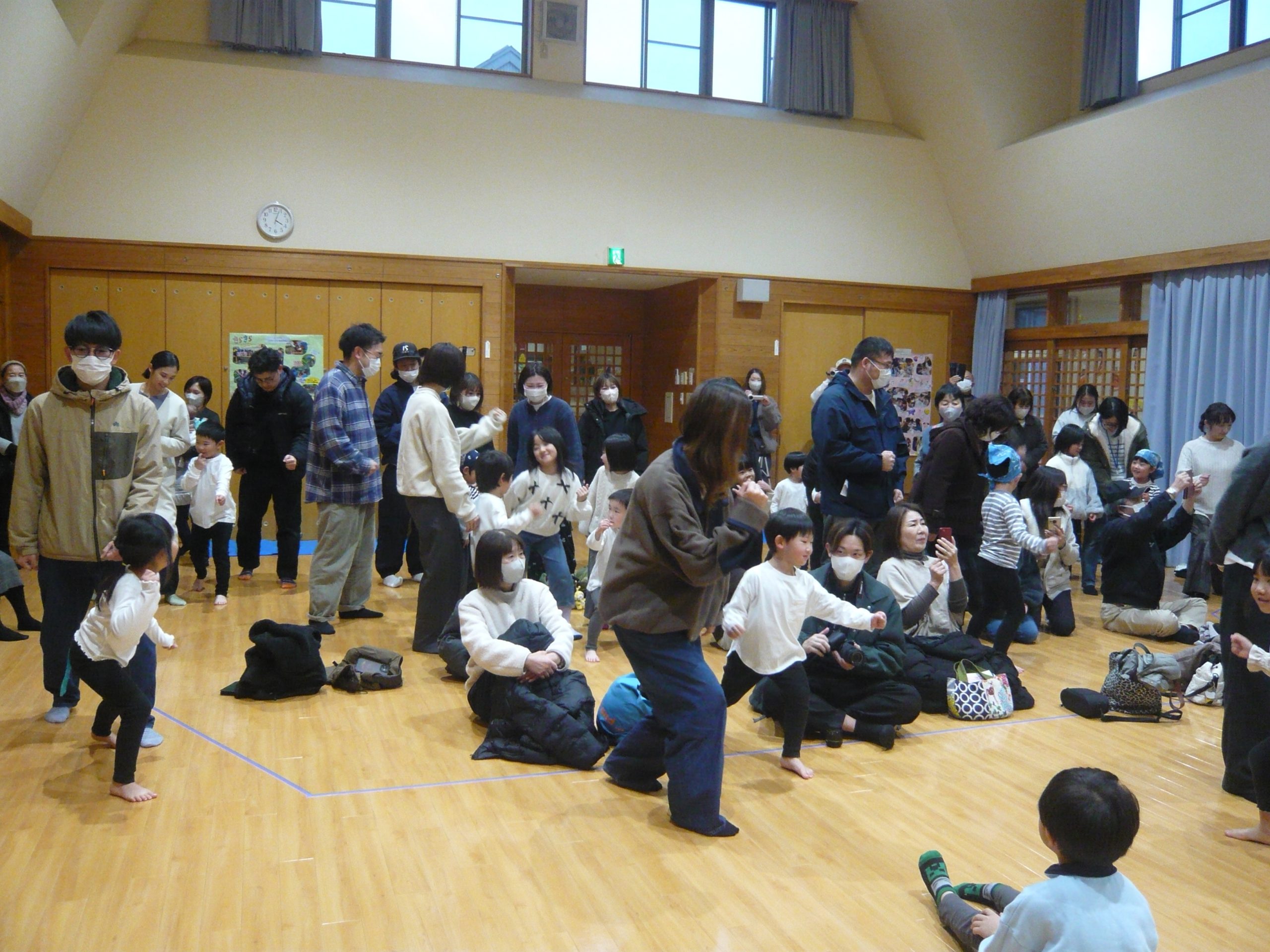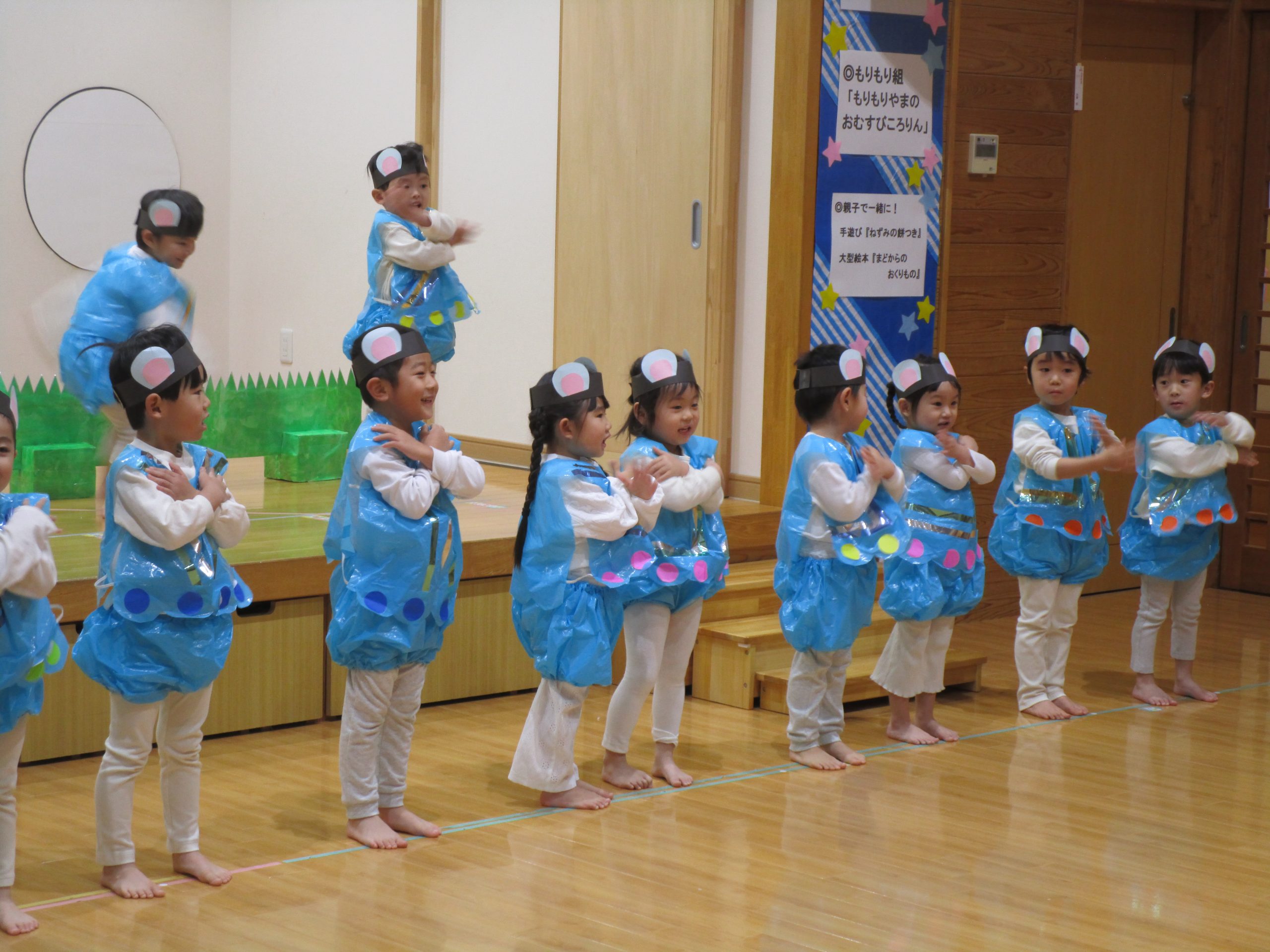 『おむすびころりん』のお話をもとにした表現遊びを発表しました。本番はちょっぴりドキドキしている様子のお友だちもいましたが、お家の人を見つけるとにっこり笑顔になっていました。