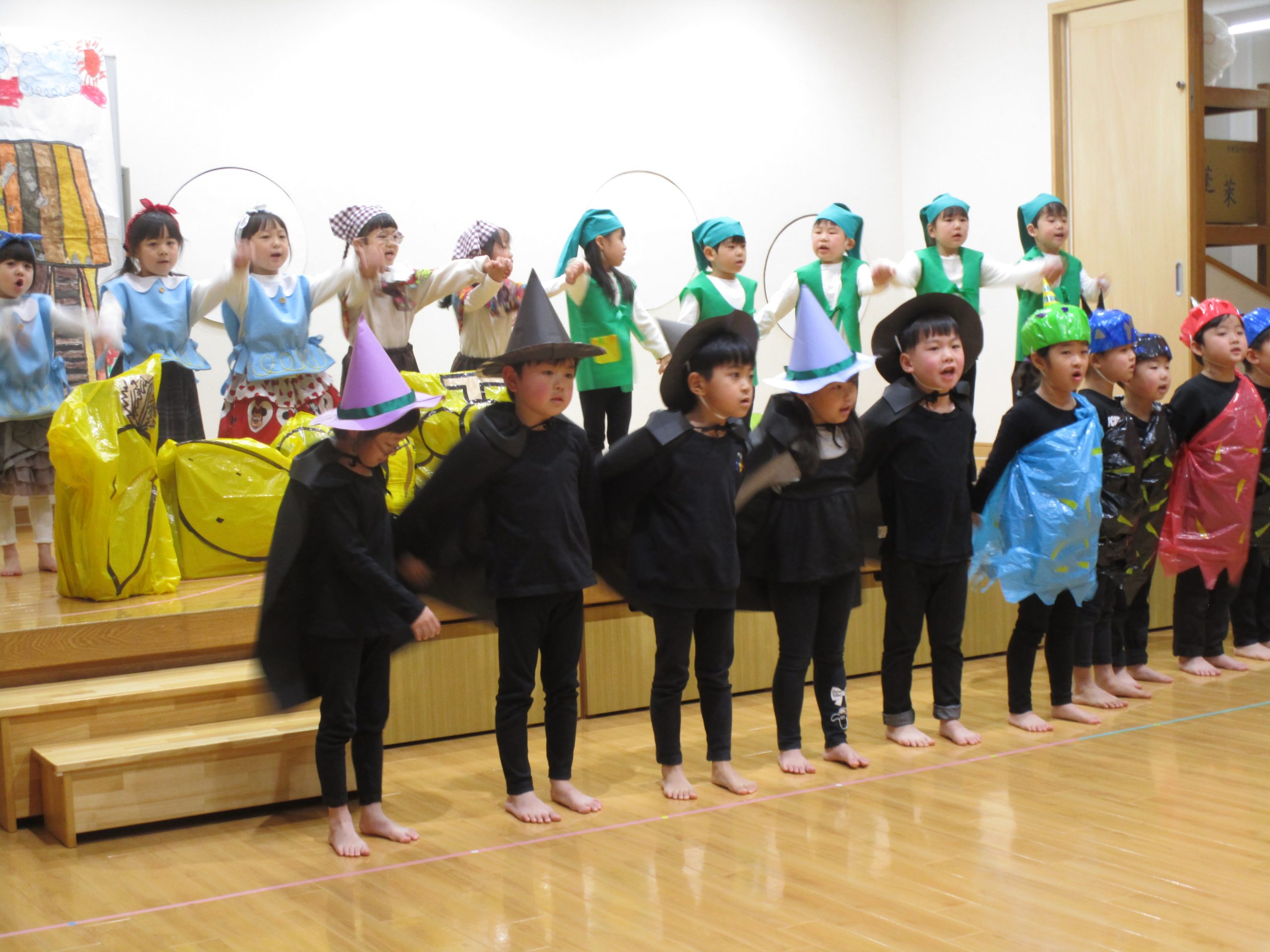 『ブレーメンの音楽隊』のお話をもとにした劇遊びを発表しました。カスタネット・スズ・タンバリン・トライアングルを使って音楽隊の仲間入り。本番前は緊張している様子でしたが、最後は元気いっぱい踊ってくれました。