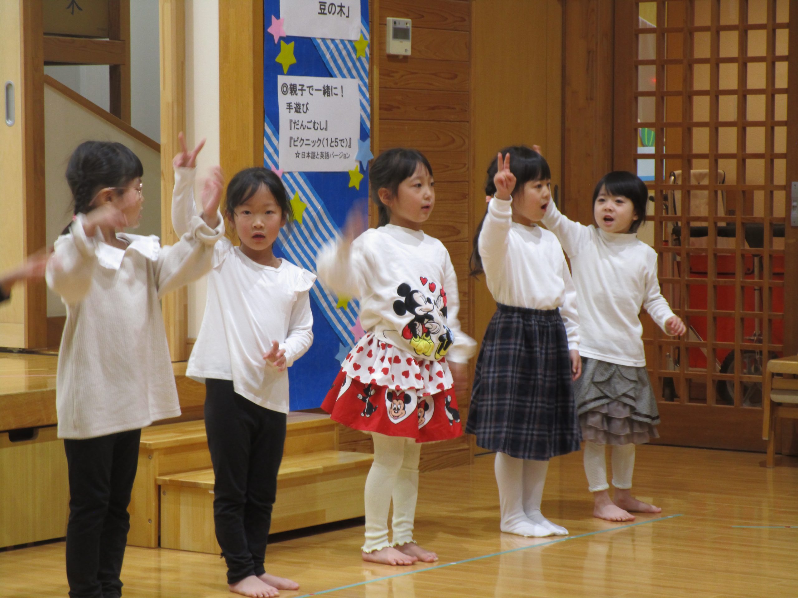ステージ発表後は、『ピクニック』の手遊びを、日本語と英語バージョンでお届け。月1・2回の英語で遊ぼうを経験しているので、発音も上手です。
