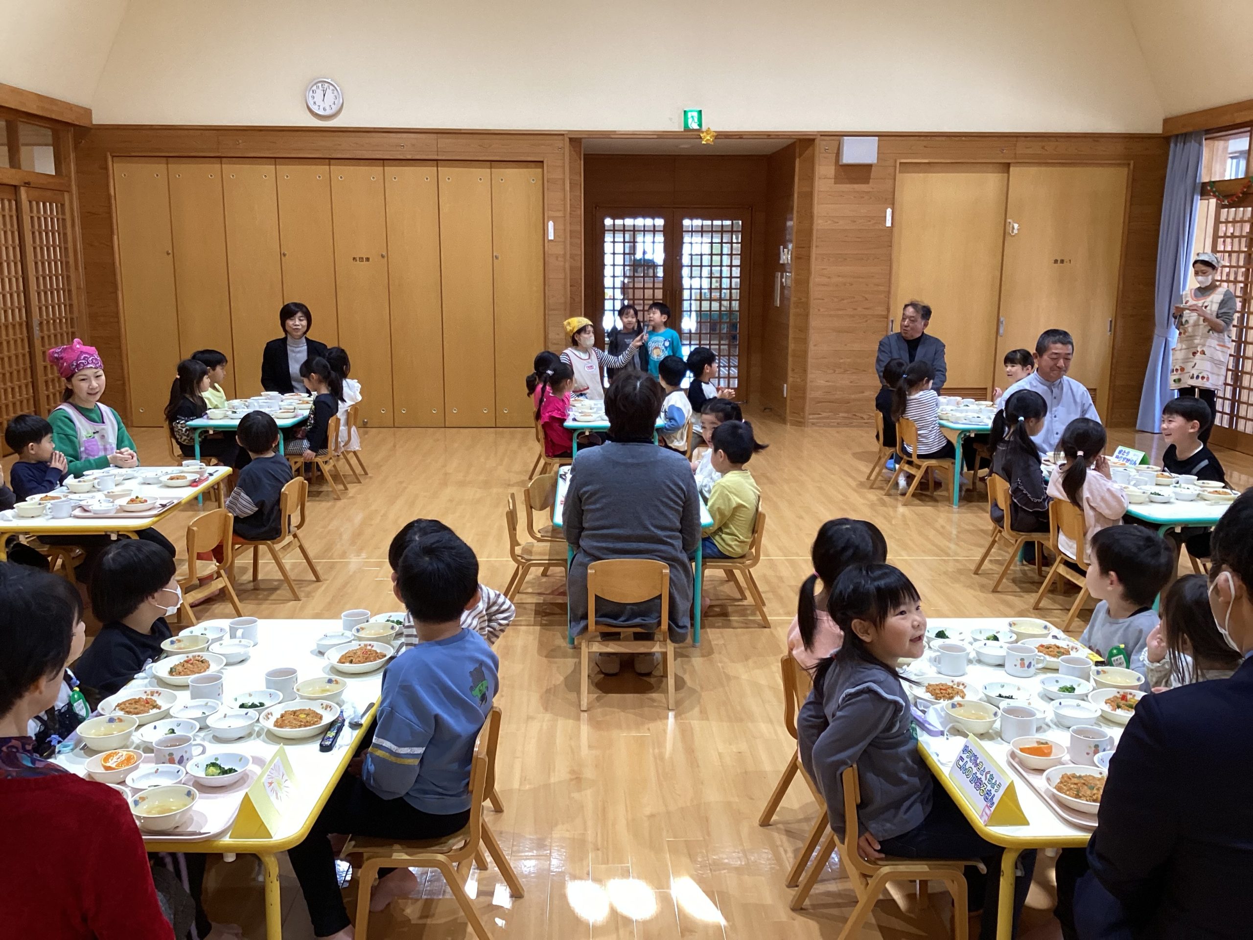 前日までに大根の漬物の味付けを決めたり、玉ねぎの皮むきやピーマンの種取りなどのお手伝いをして、お客様に喜んでもらうための準備をしました。一緒に食べながら「おいしい」と食べてもらい、大・大・大満足のきらきら組さんとわくわく組さんでした。