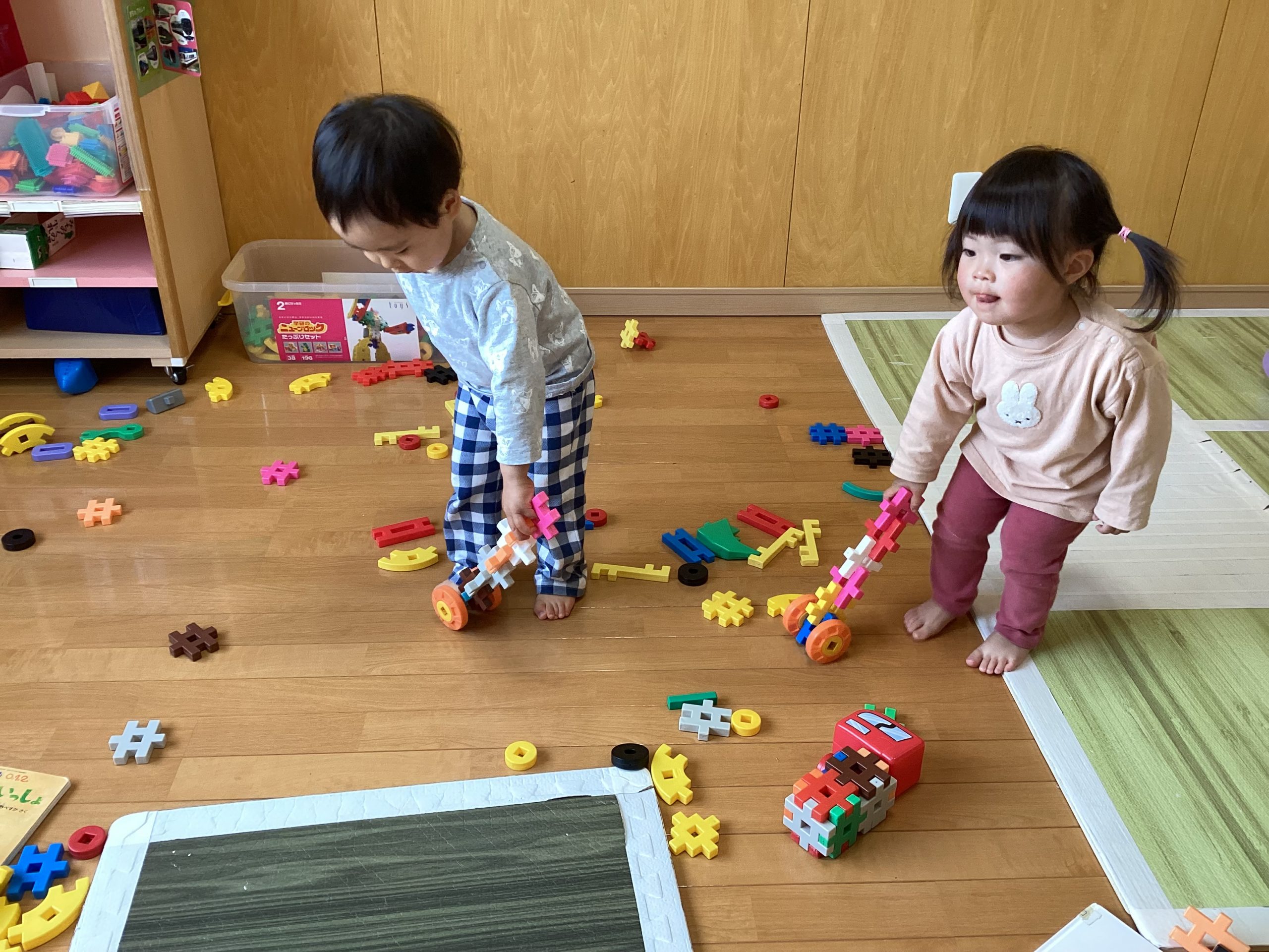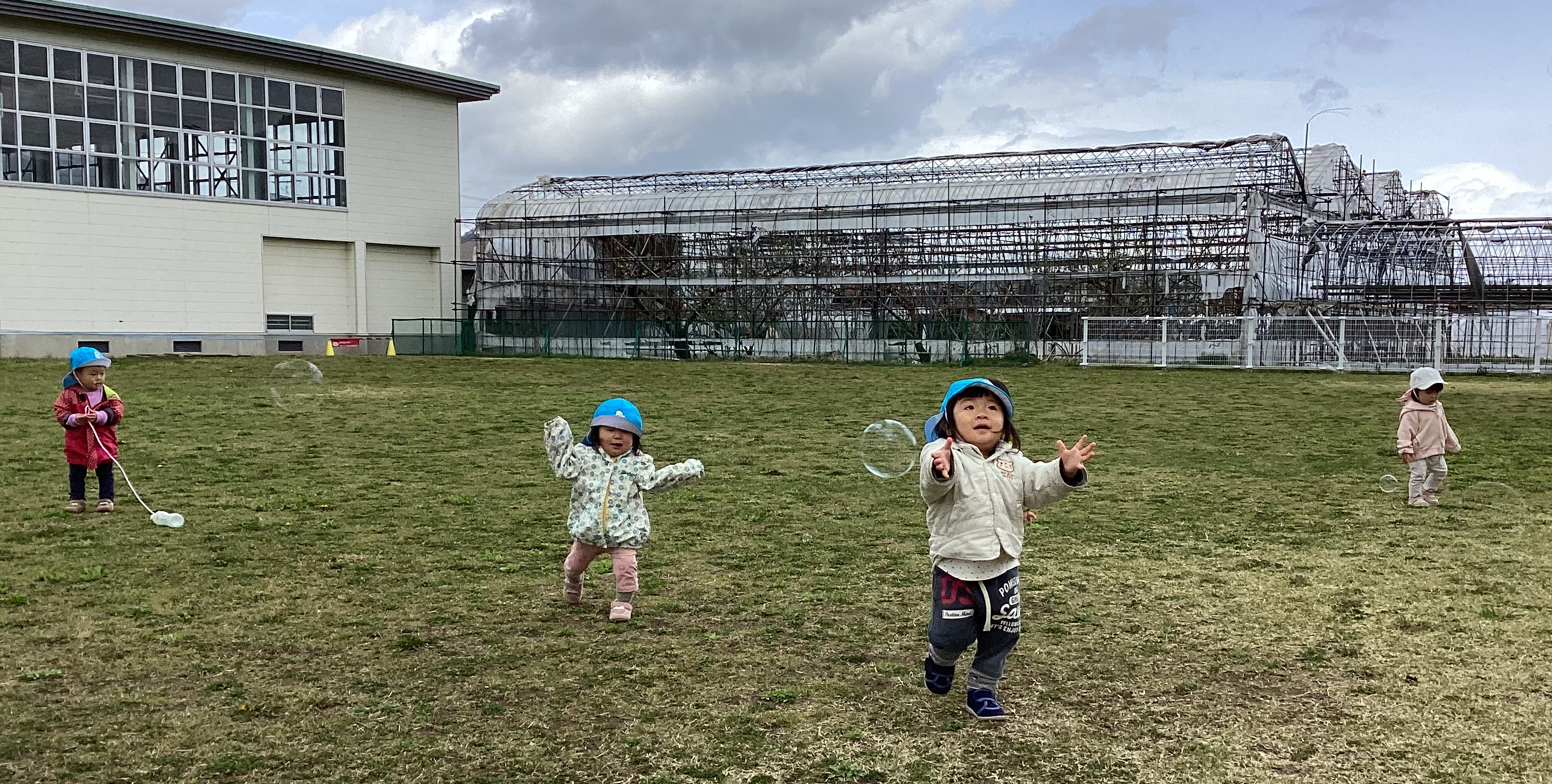 爽やかな春の朝、お友だちと電車ロープに繋がって歩きながら、きれいに咲いたお花や周りの自然をゆったり眺めてお散歩を楽しみました。広い原っぱでシャボン玉を追いかける力もついたぴょんぴょん組です。お部屋の中でも、興味をもったことに夢中になって遊んでいます。