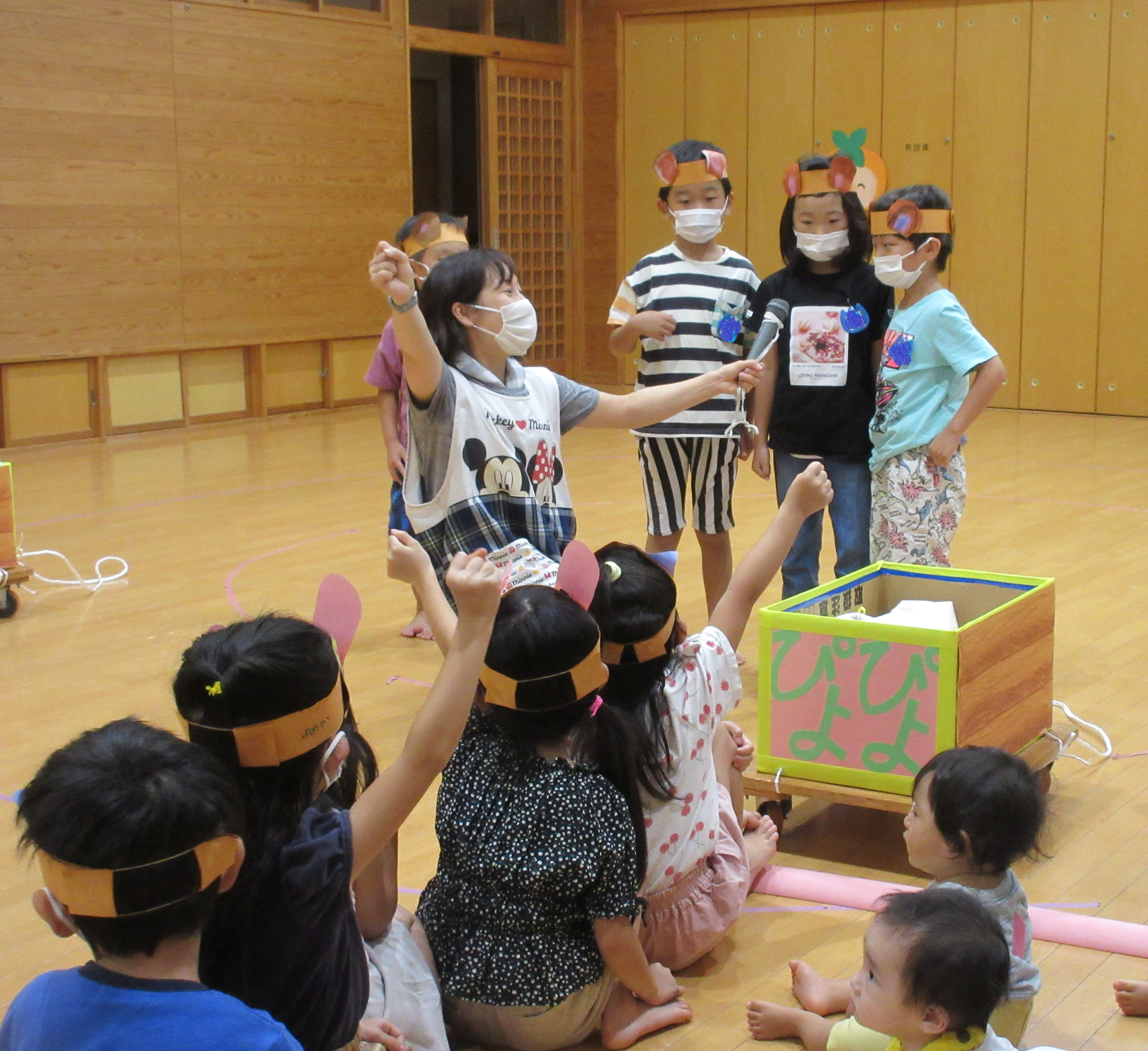 いろんな動物のお面をつけて集まった2歳児にこにこ組さん。今日は、4歳児わくわく組さんと「まりいれ」を楽しむ第1回プレプレ運動会です。