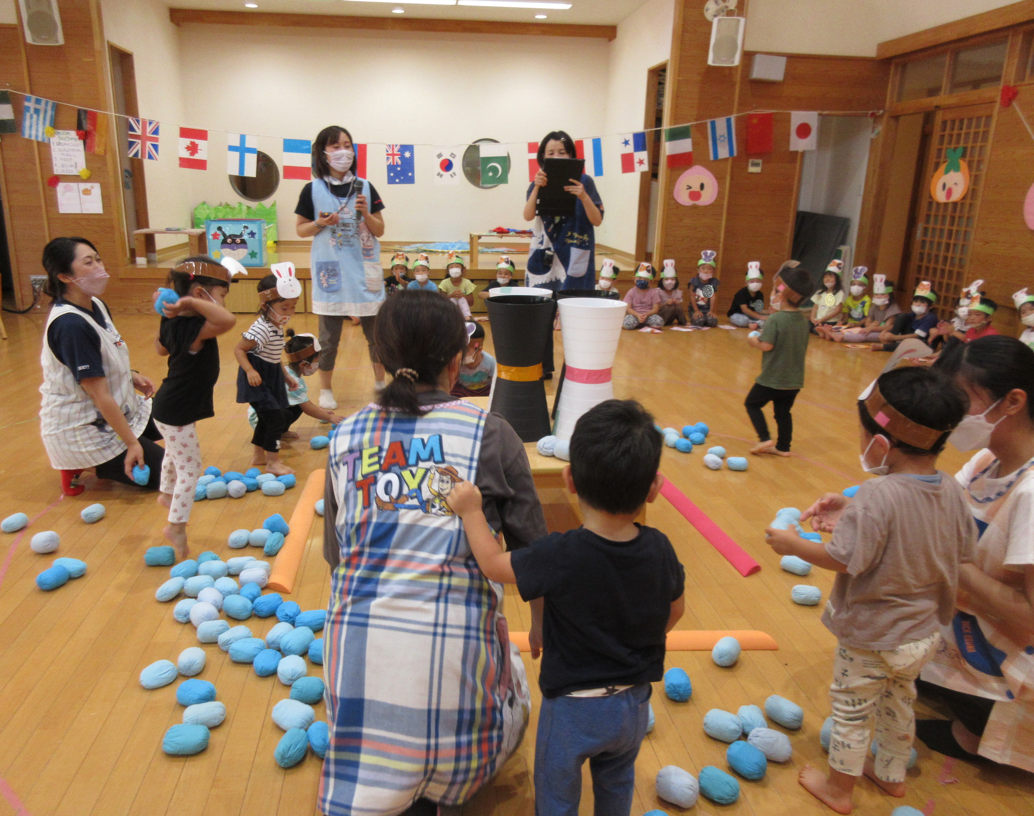 2歳児にこにこ組さんは、「ぽいっ」と投げたら入る高さのやさしい「まりいれ」です。後ろで、4歳児わくわく組のお兄さんお姉さんが「がんばれ~」と応援しています。