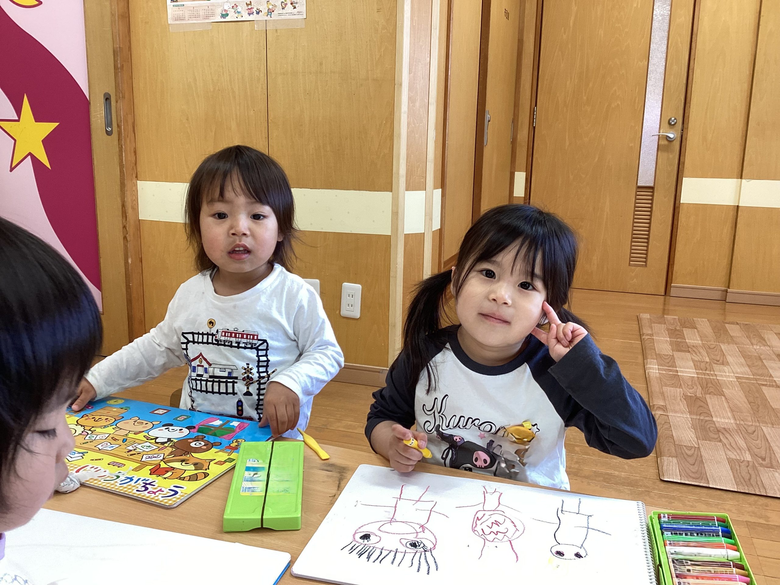 お部屋では、好きな遊びを見つけられるように楽しいコーナーを作っています。「きれいなクレヨンでいっぱいかきたいな。」