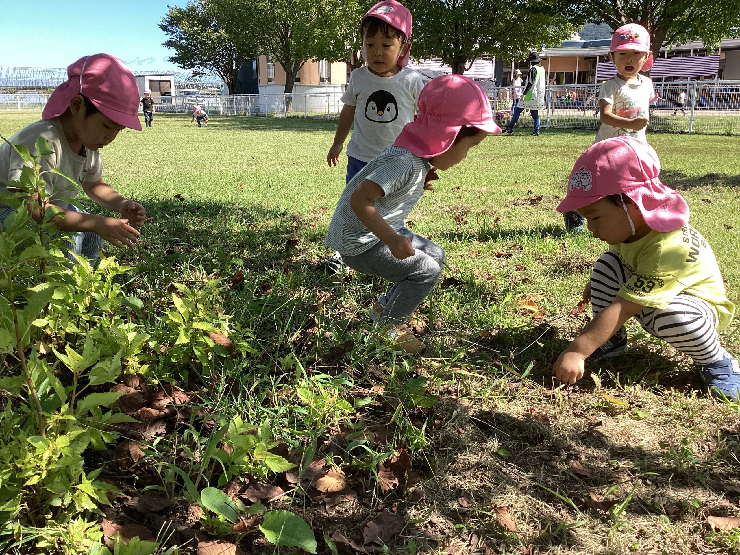 「バッタいるよ!」 「こっちに、こうろぎいた!!」 友達と会話を弾ませながら虫を捕まえようとしている子どもたちです!
