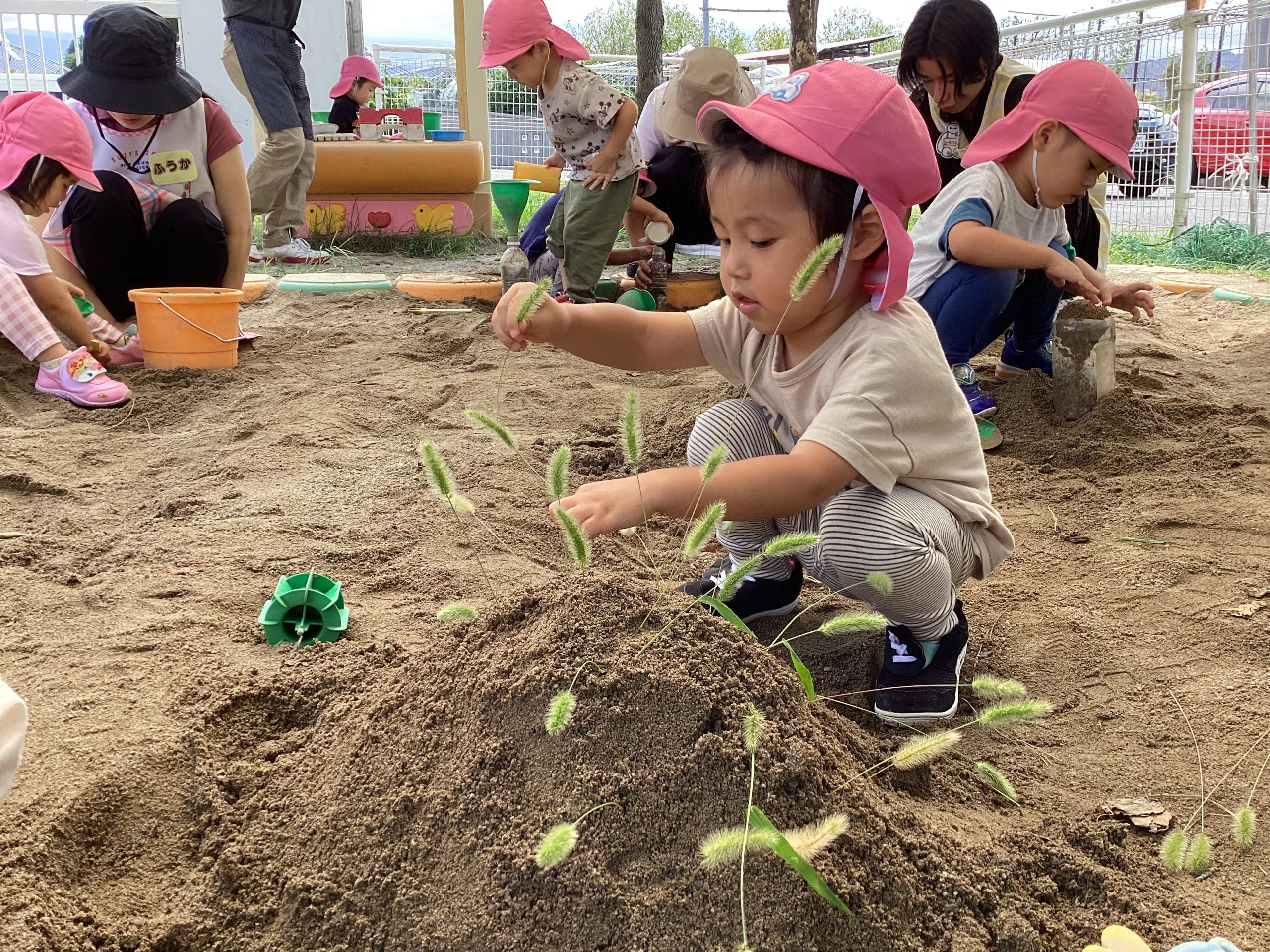 「ぎざぎざお山を作ってるの~。」一本一本猫じゃらしをさして、砂場で素敵なアートにしていました!芸術の秋ですね!!