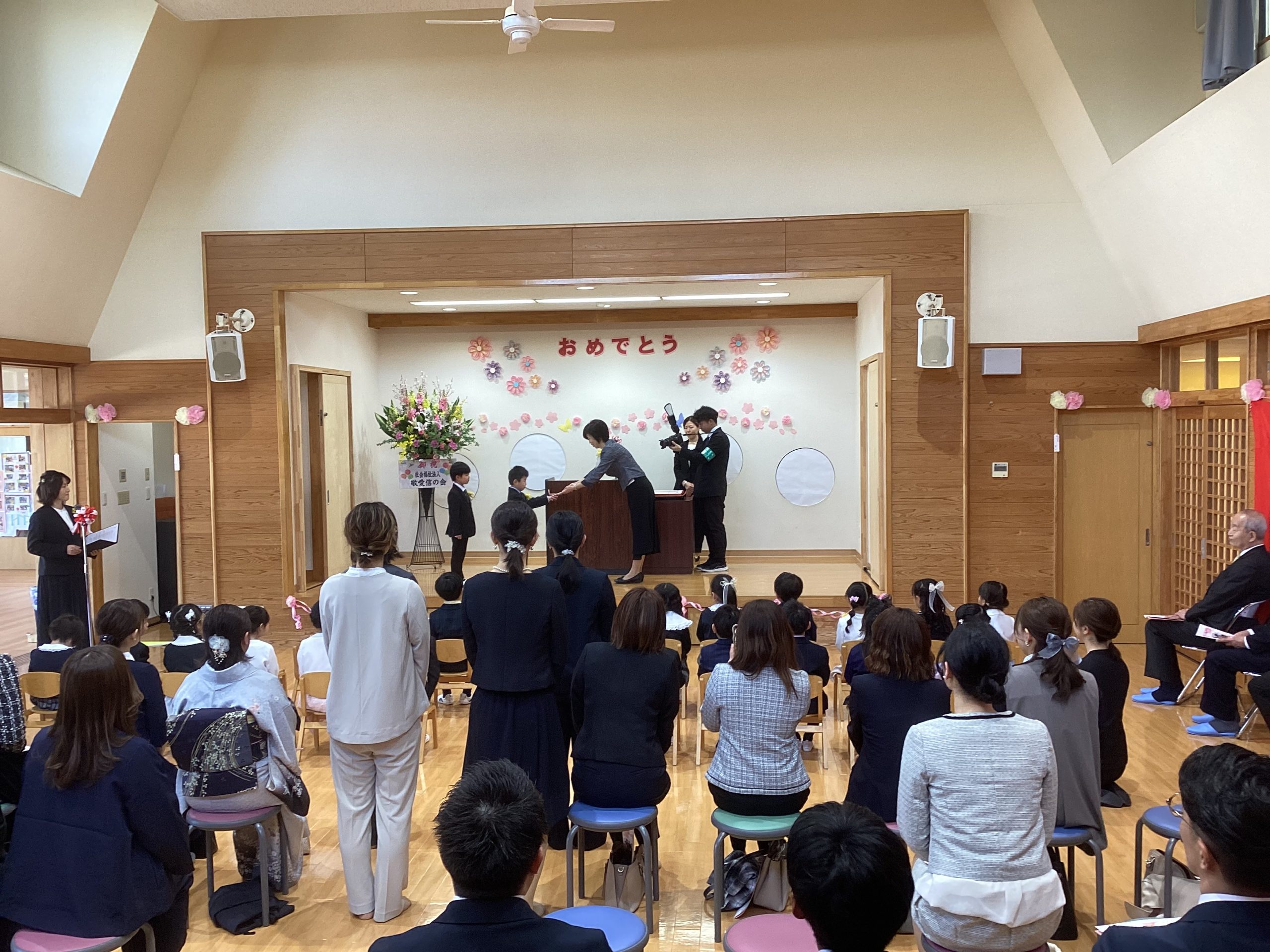 上山あいこども園に移行してから初めての卒園式が、3月20日に行われました。前日の雨が嘘のように、春のあたたかい日差しに包まれながら第1号の卒園証書が授与されました。