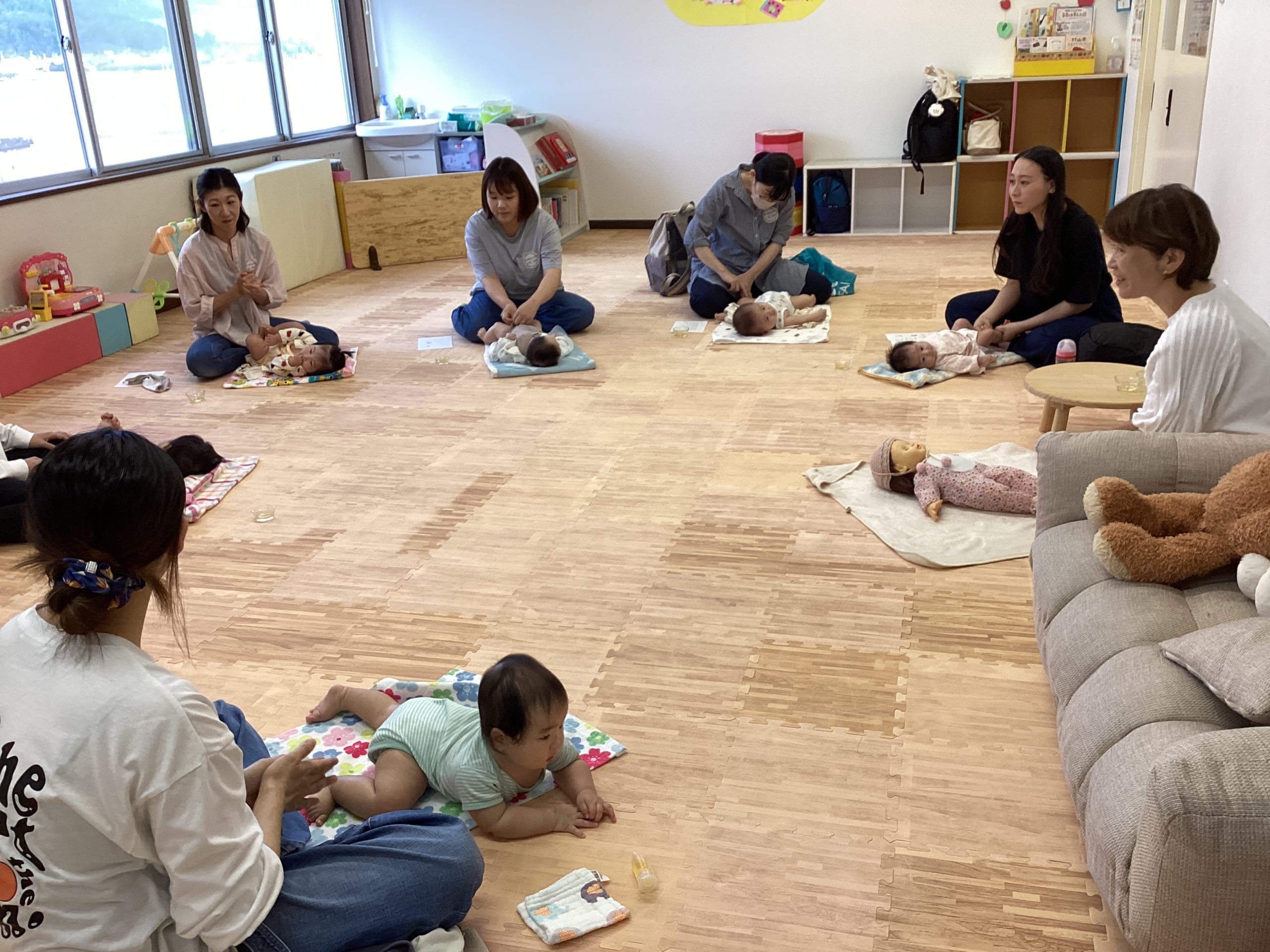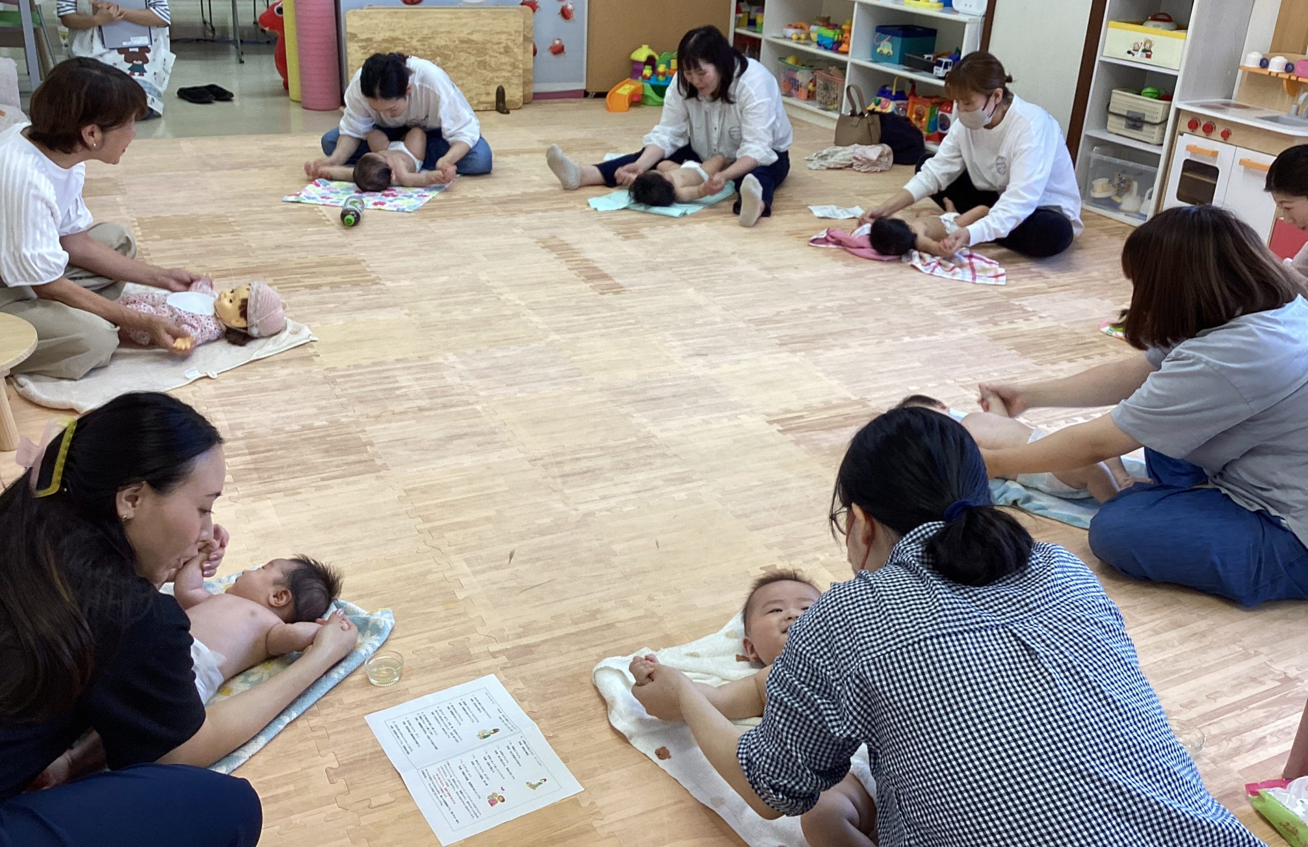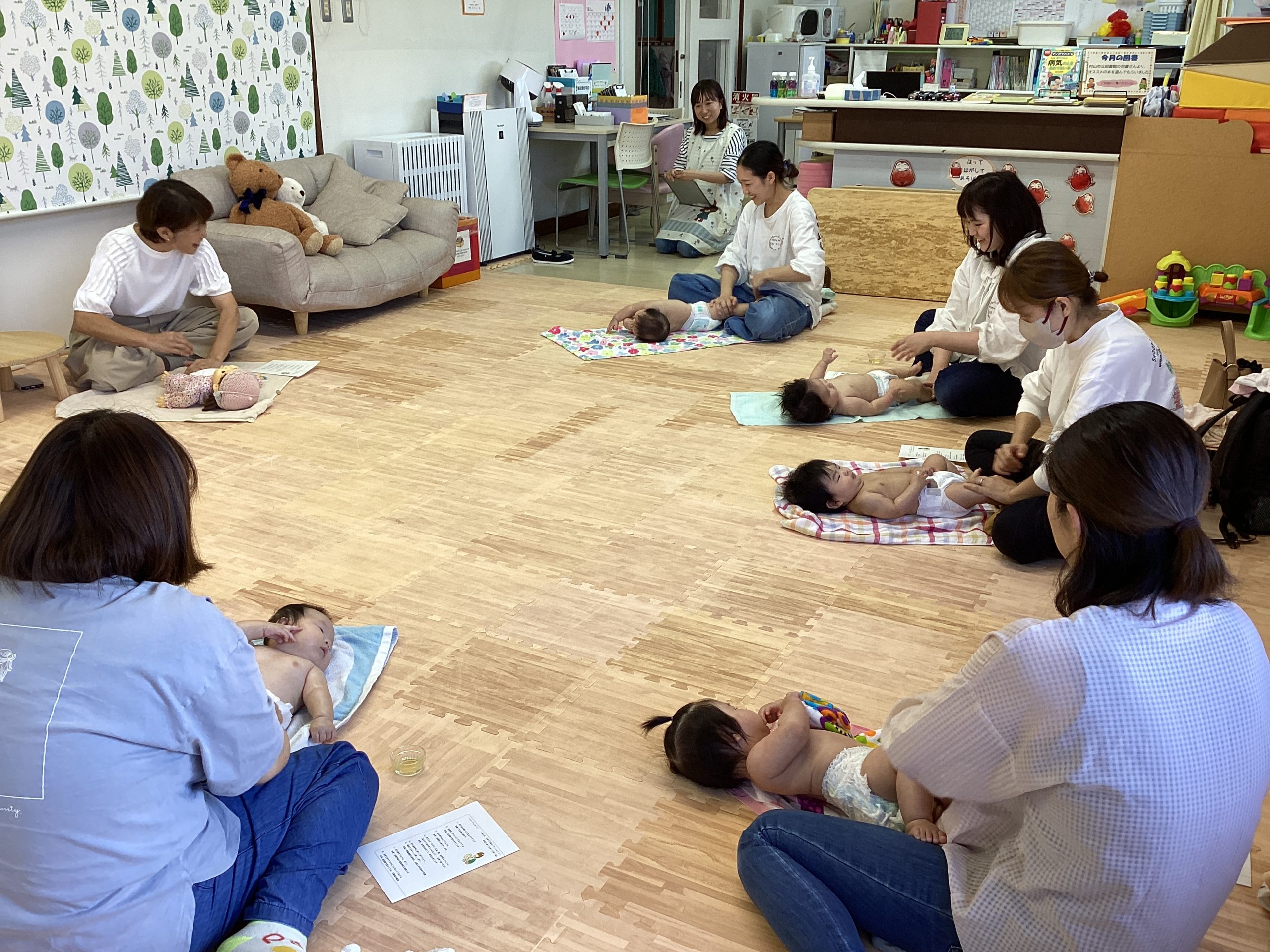 生後1ヵ月~6ヵ月のかわいい赤ちゃん達が7人集まり、和やかな雰囲気でベビーマッサージが始まりました。