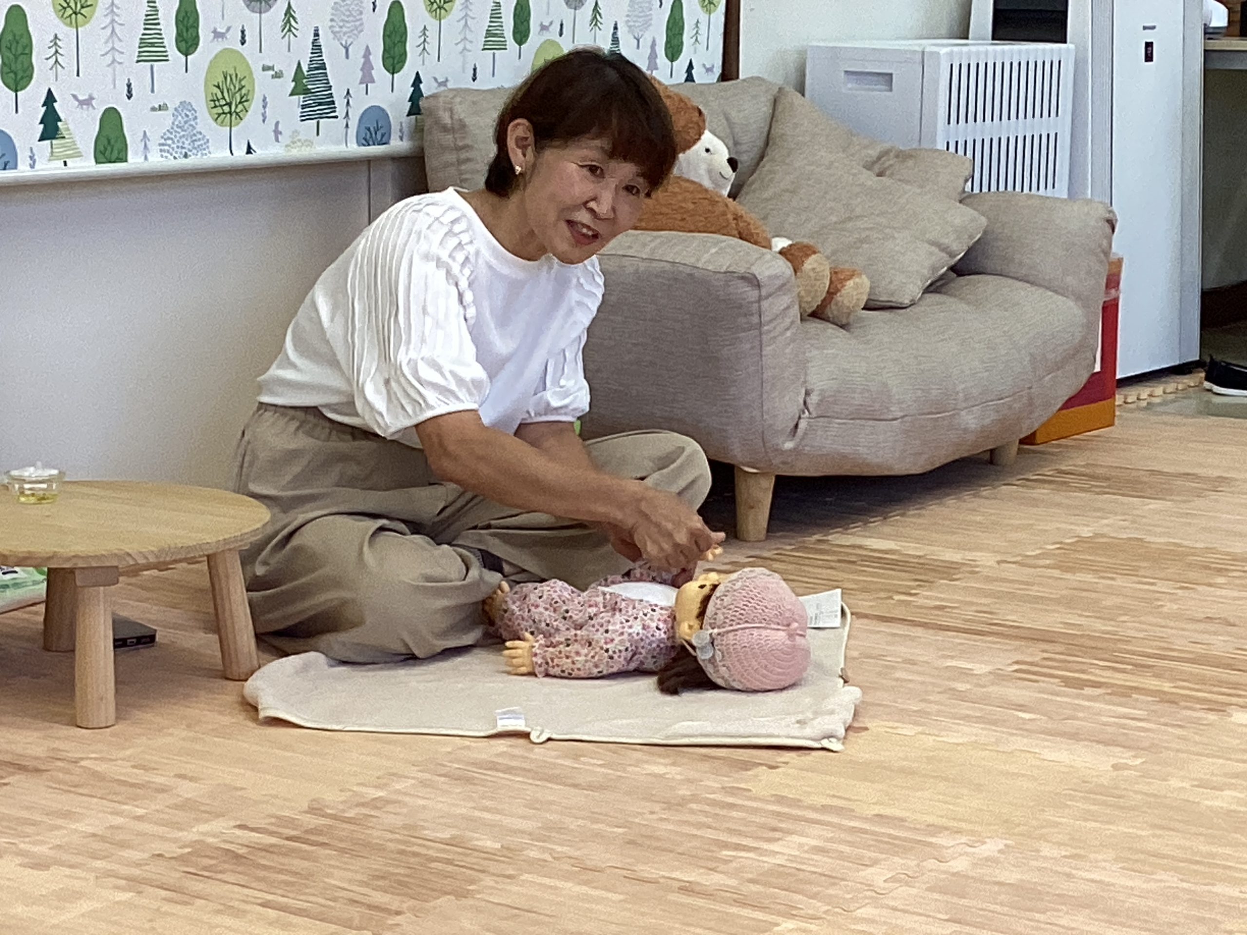 今月のまなびの広場は、ベビーマッサージインストラクターの庄司美保子先生をお招きして「ベビーマッサージ」を開催しました。