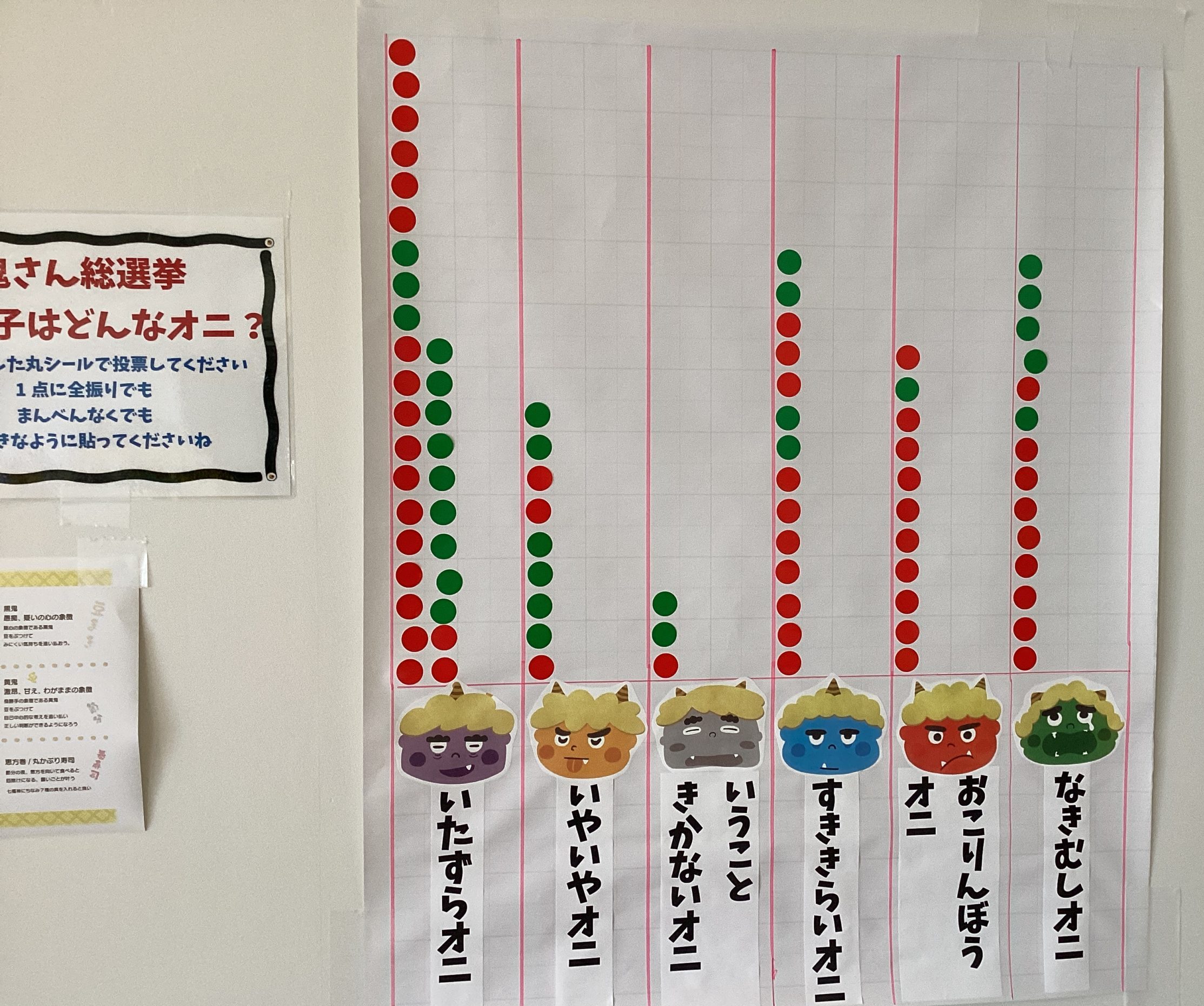 今日参加してくれたお母さんたちには、「うちの子はどんなオニ?・鬼さん総選挙」での投票をお願いしました。