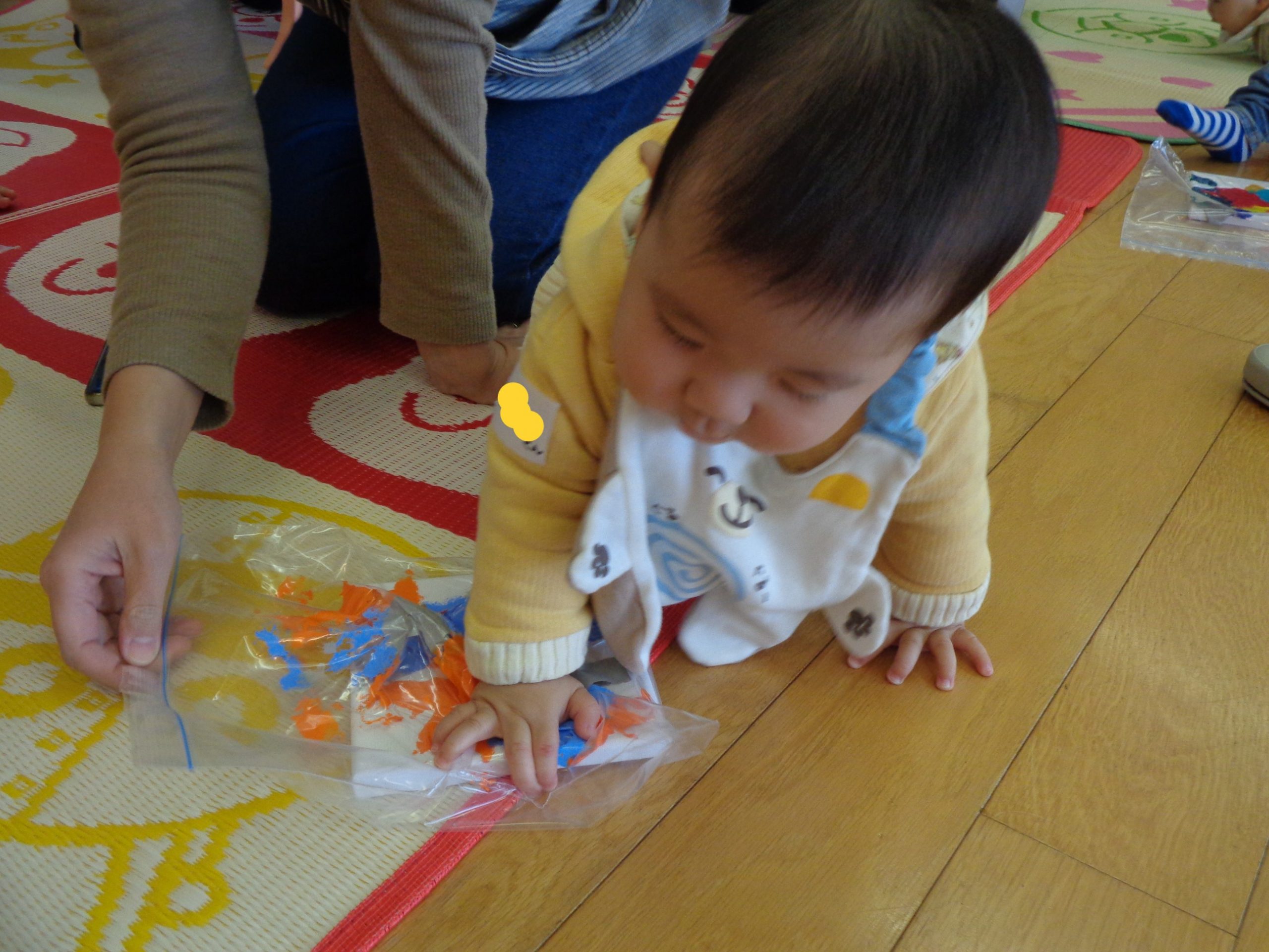 かわいい手で一生懸命ペタペタ♪ 絵の具が広がっていって楽しいね!