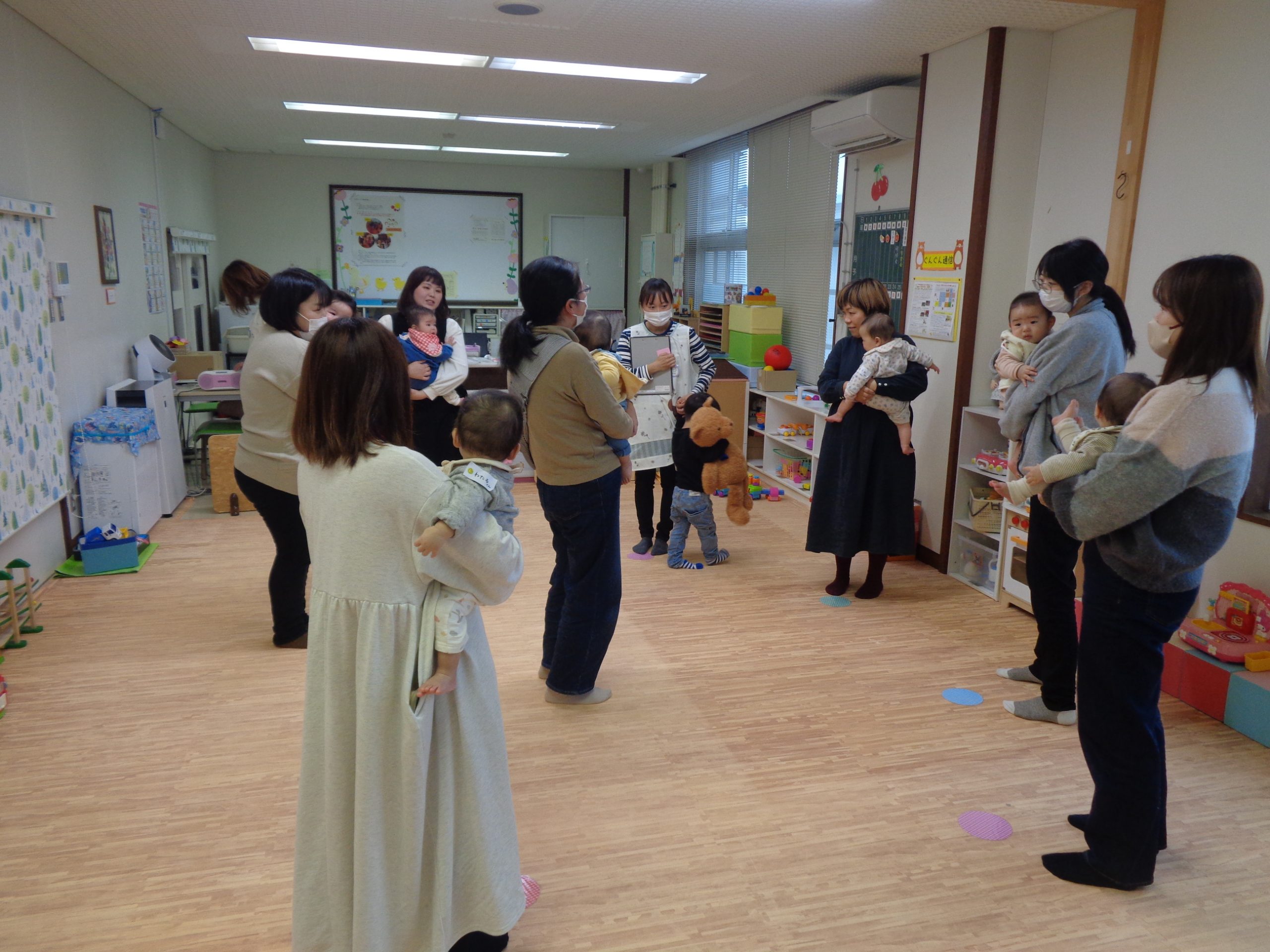 最後は、大好きなお母さんに抱っこしてもらって「フルーツバスケット」をして遊びました!お題は、「育児」「家族」「出産」「家事」などです。