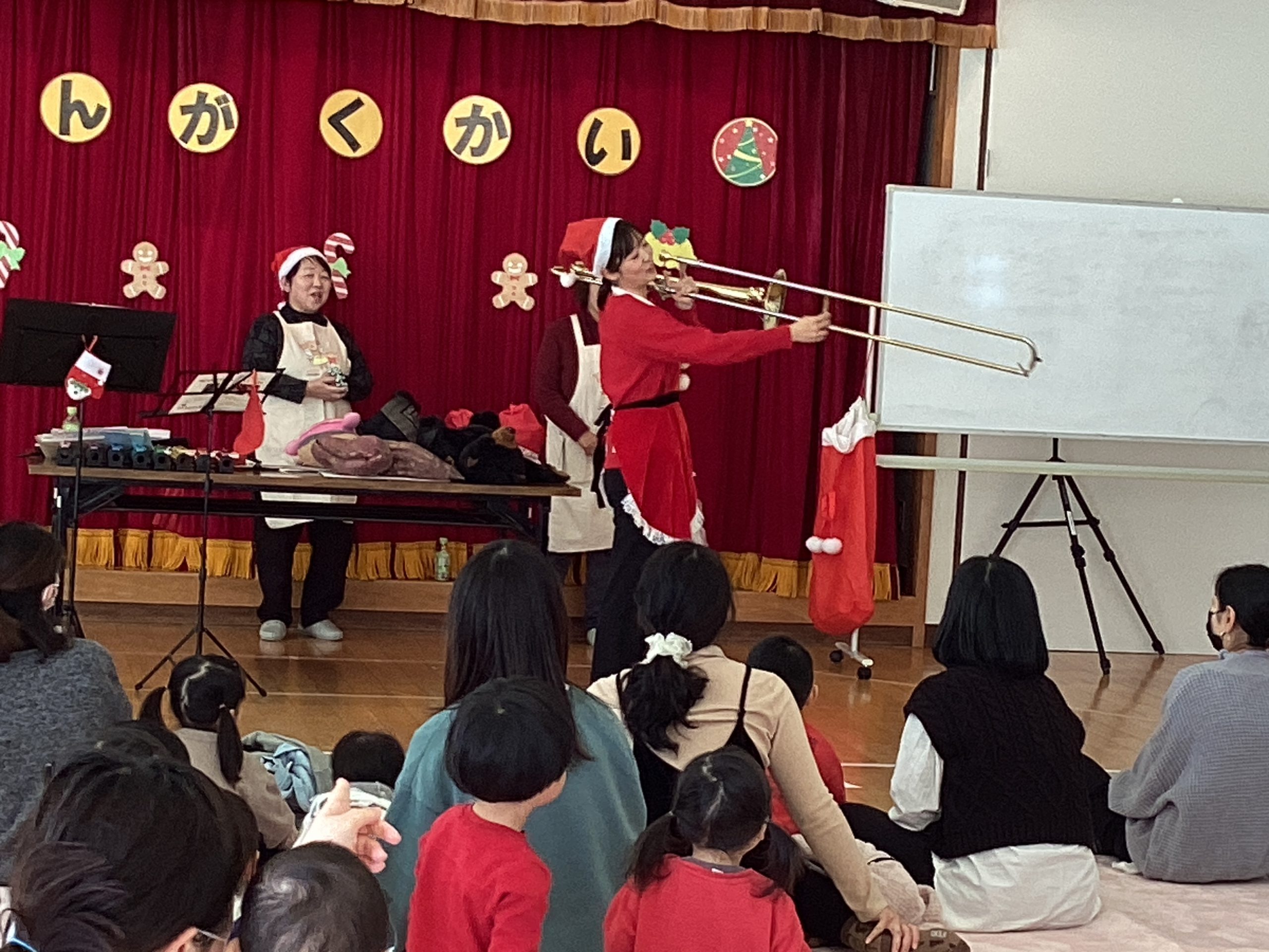 ピアニカで季節の歌の演奏や、トロンボーンではトトロなど子どもたちが大好き音楽を演奏してくださいました。初めてトロンボーンを見たり聞いたりしたお友だちもいたかもしれませんね♪