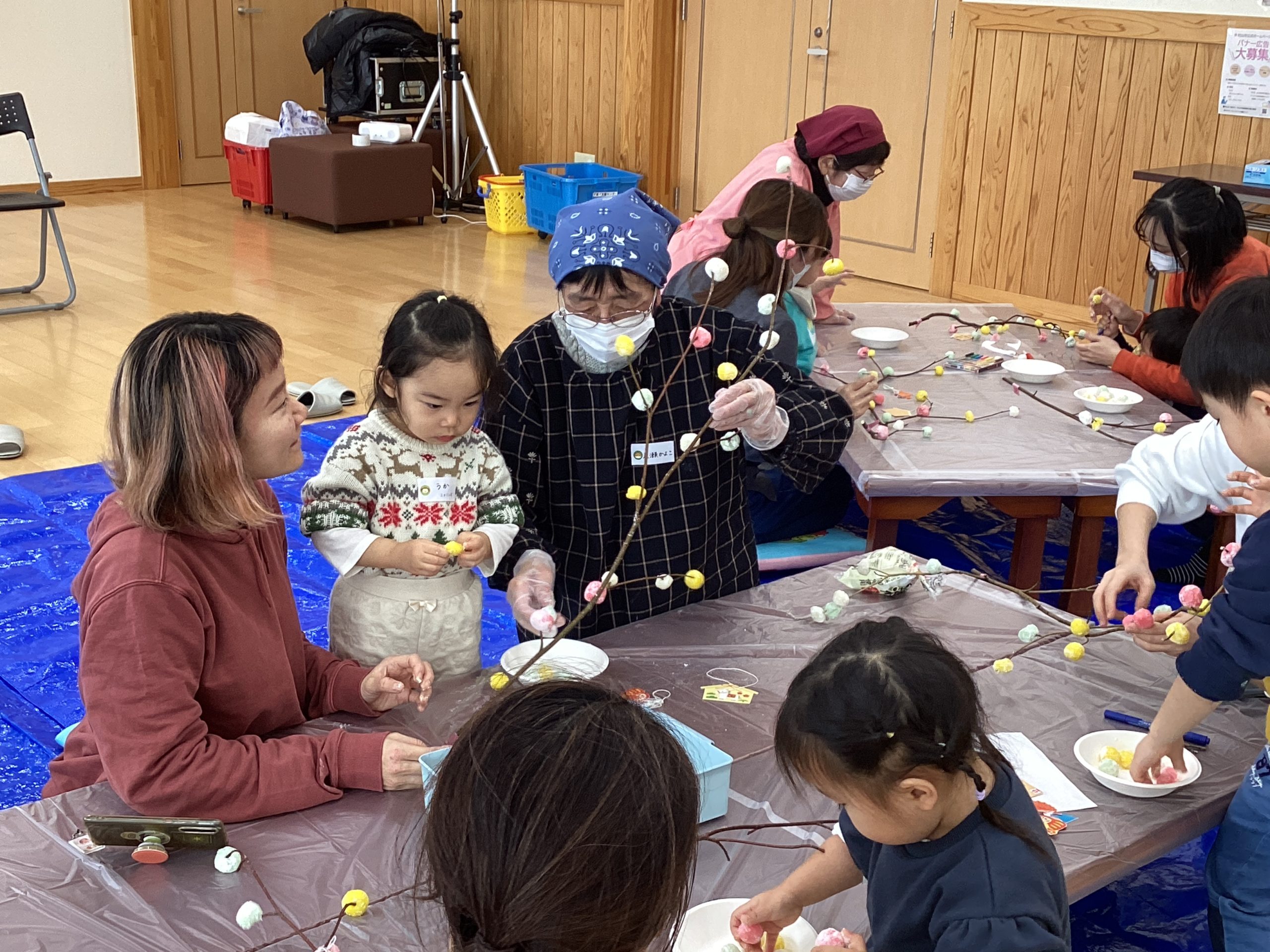 最後はミズキの木に団子や飾りをつけていきます。