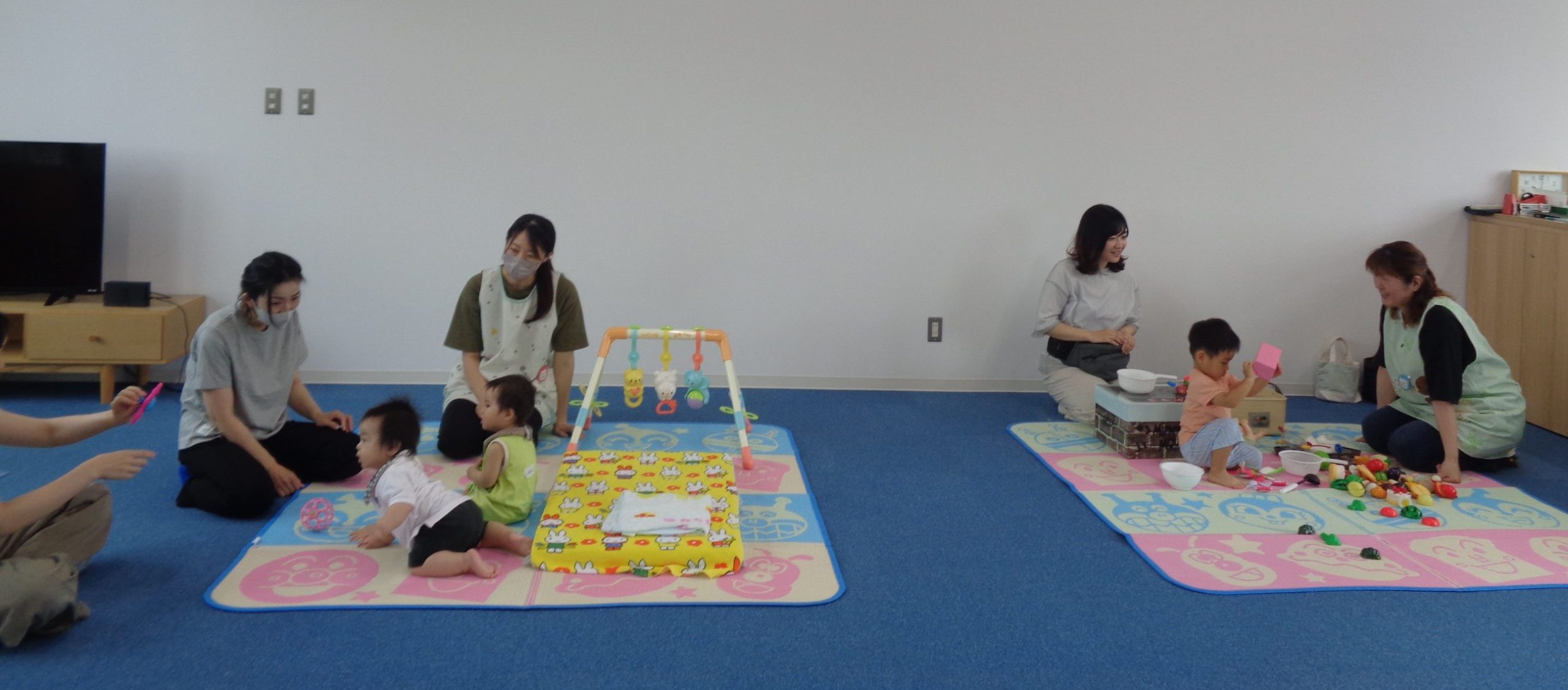 じゅうたんが敷いてある広々とした会場です。自由遊びや大型絵本など色々な楽しいことを準備していますので、ぜひお気軽に遊びに来てください。入退室も自由なのでお子さまの様子に合わせていらしてくださいね♪