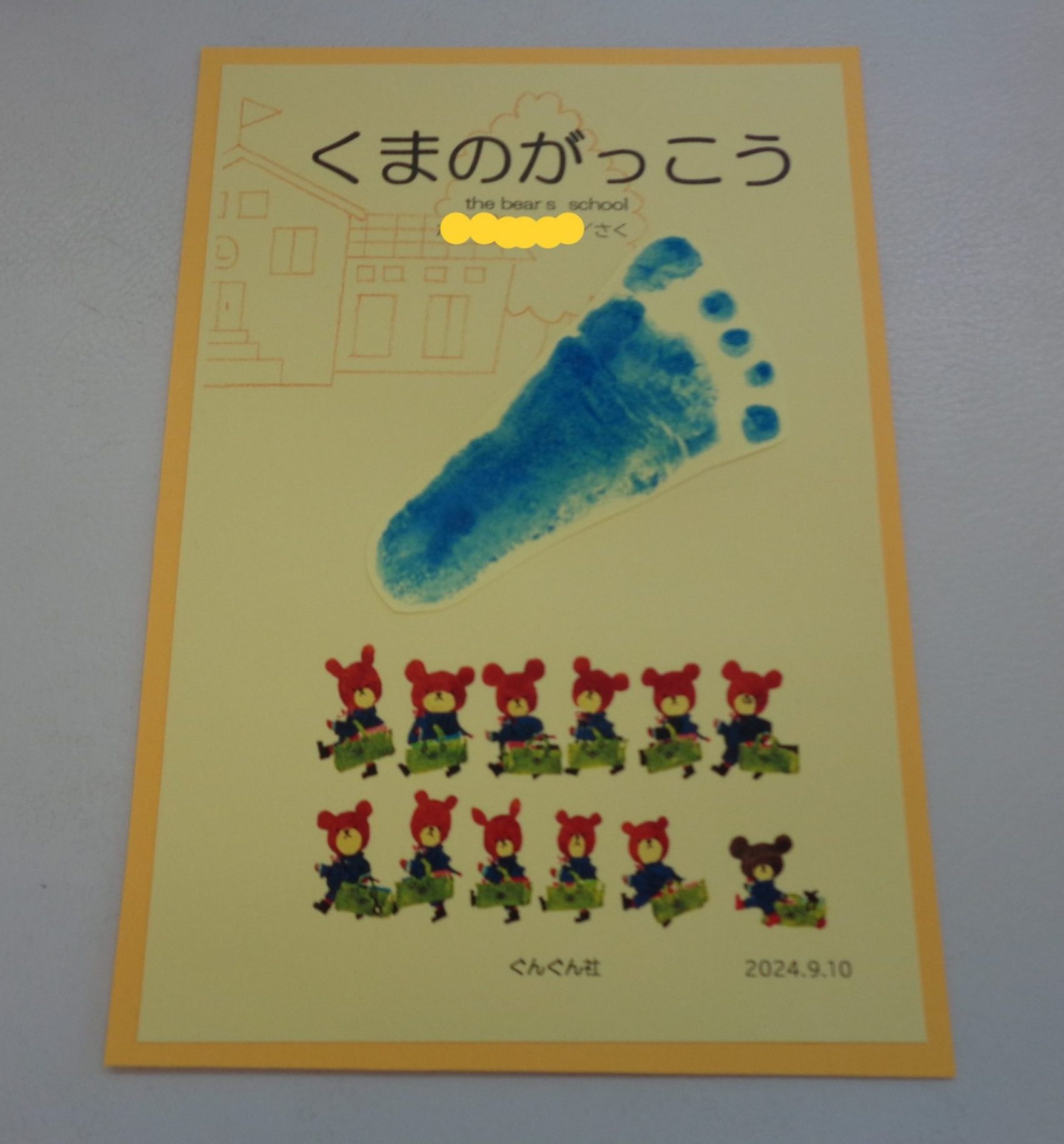 できあがった足型を、絵本「くまのがっこう」をモチーフにしたフレームに貼って完成です。