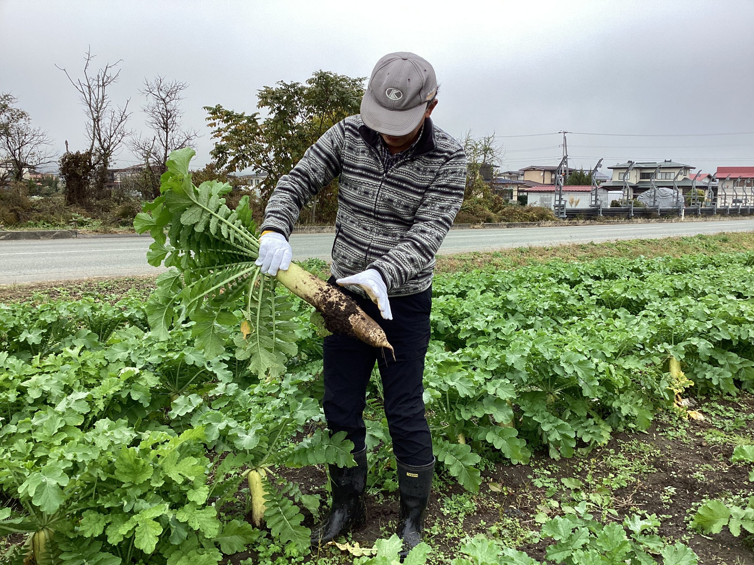 初めに青柳さんより大根の抜き方を教えていただきます。横に引っ張ってしまうと折れてしまうこともあるのでまっすぐ抜くのがポイントだそう。立派な大根ですね!