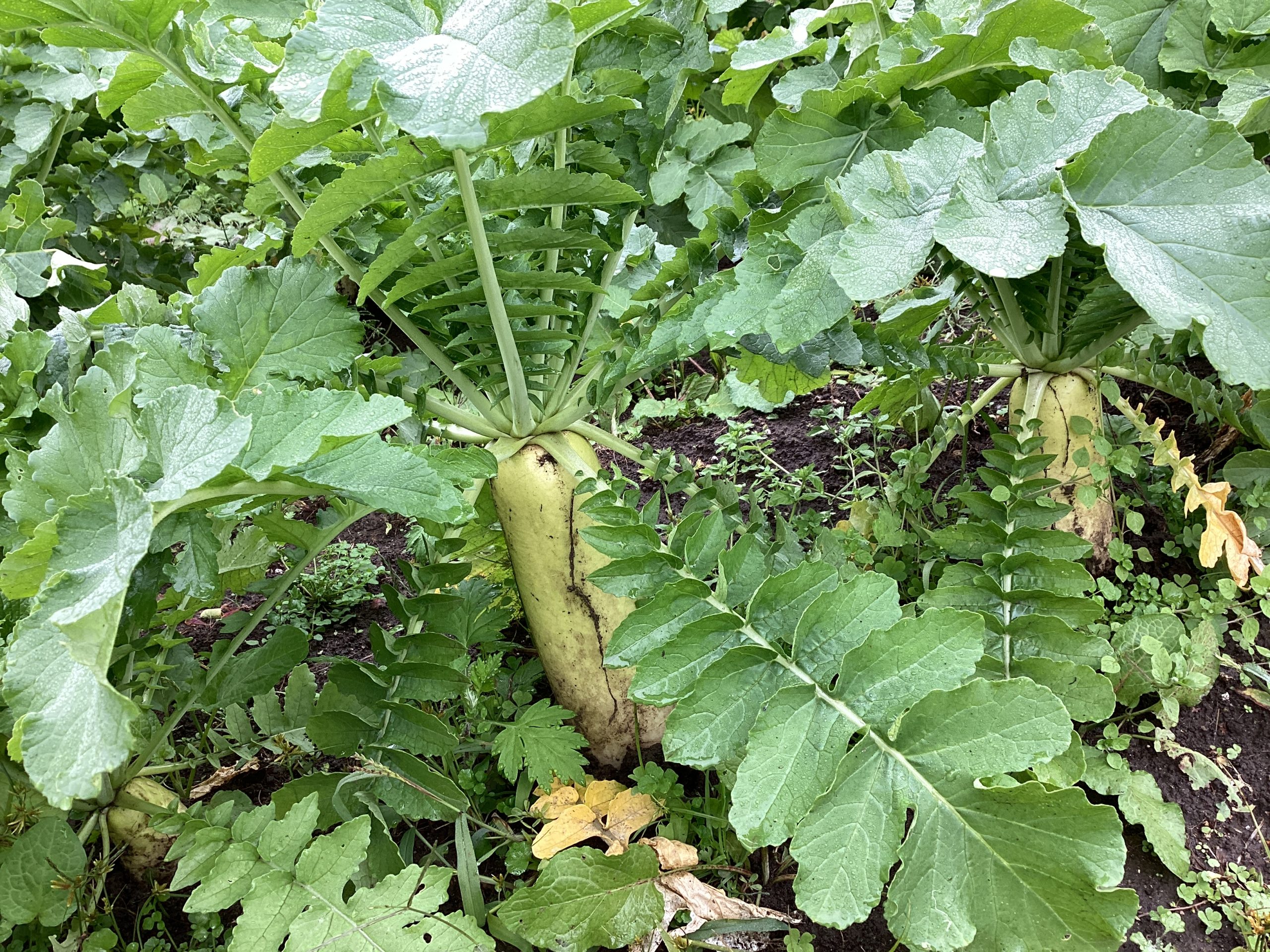 小さいお子さんにとって収穫前の大根を見ることはあまりないのではないでしょうか。大根が大きく顔を出しています。