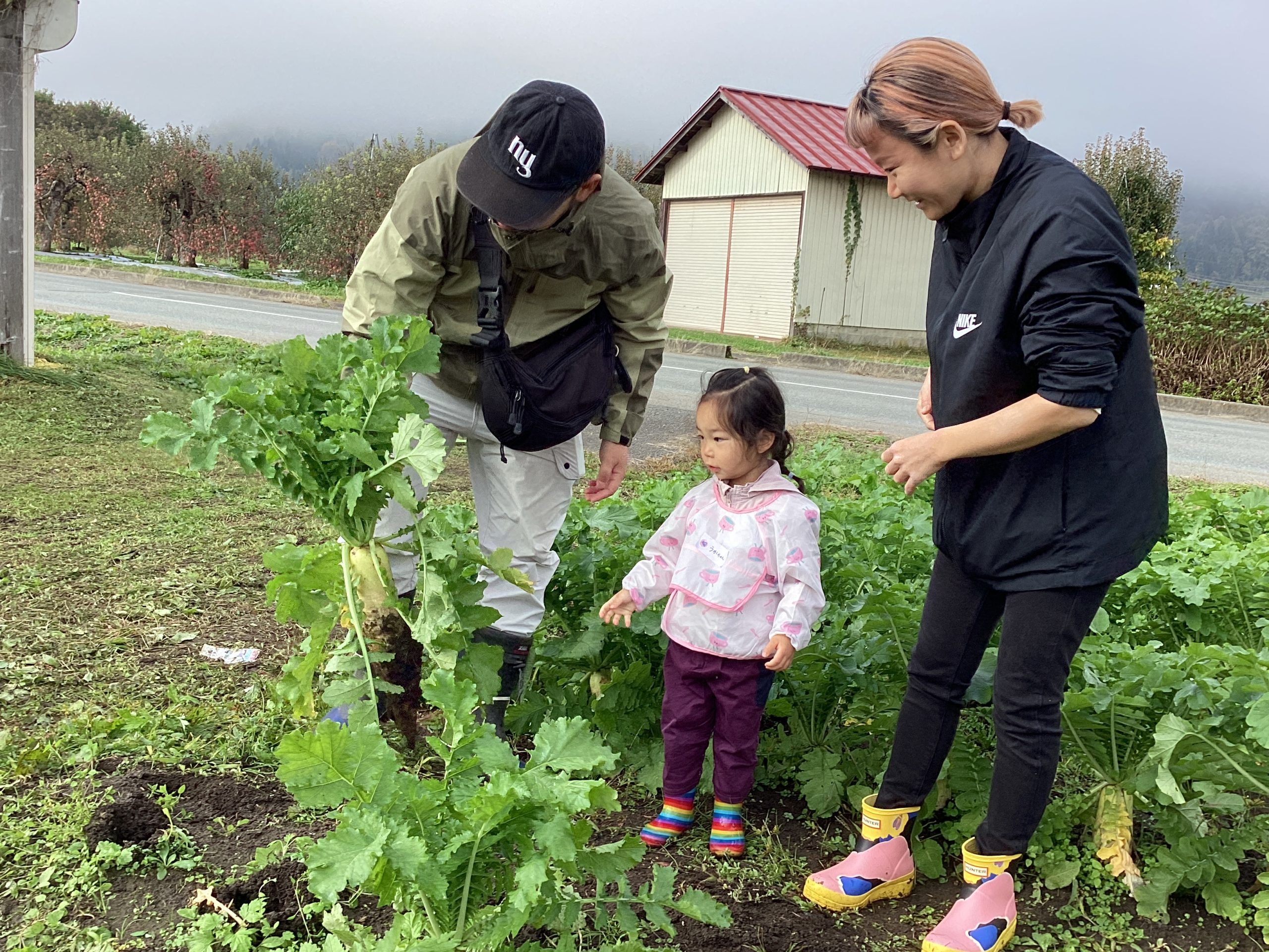 小さいお子さんにとって収穫前の大根を見ることはあまりないのではないでしょうか。大根が大きく顔を出しています。
