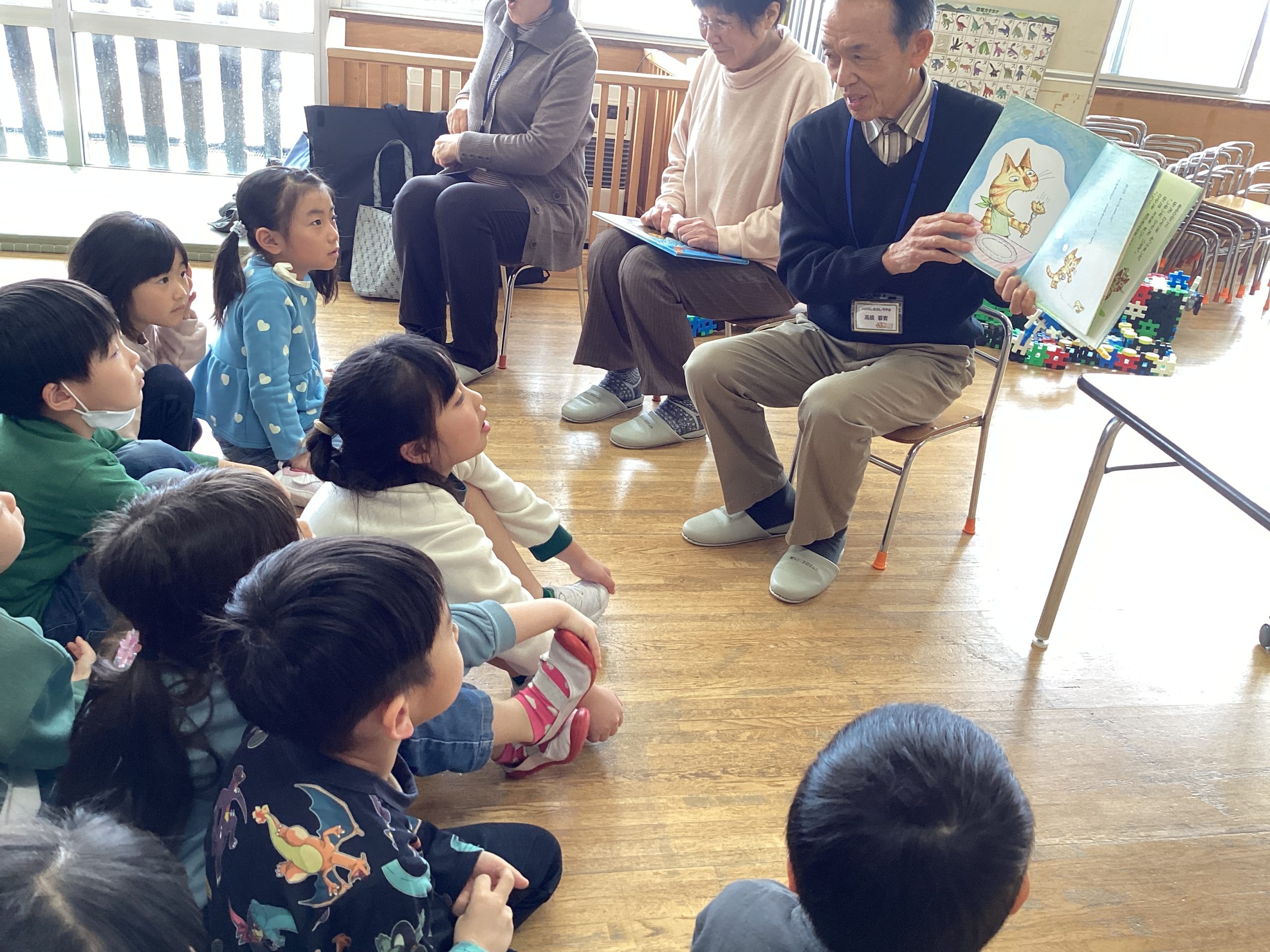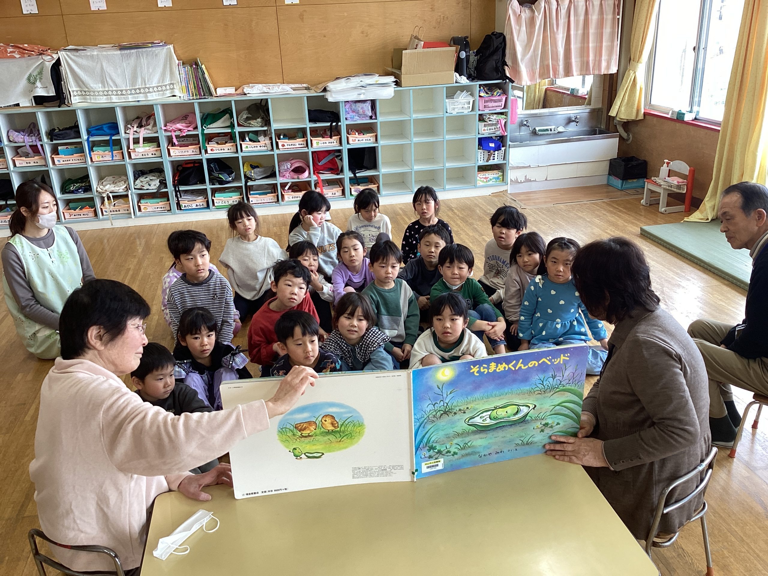 「ぐんぐん」で読み聞かせをしていただいた後は、おしろやまさんに「はやま認定こども園」の年長ぶどう組でも読み聞かせをお願いしています。まもなく1年生になる子どもたち…。話の聞き方もとても立派で、約30分集中して絵本の世界に浸っていました。