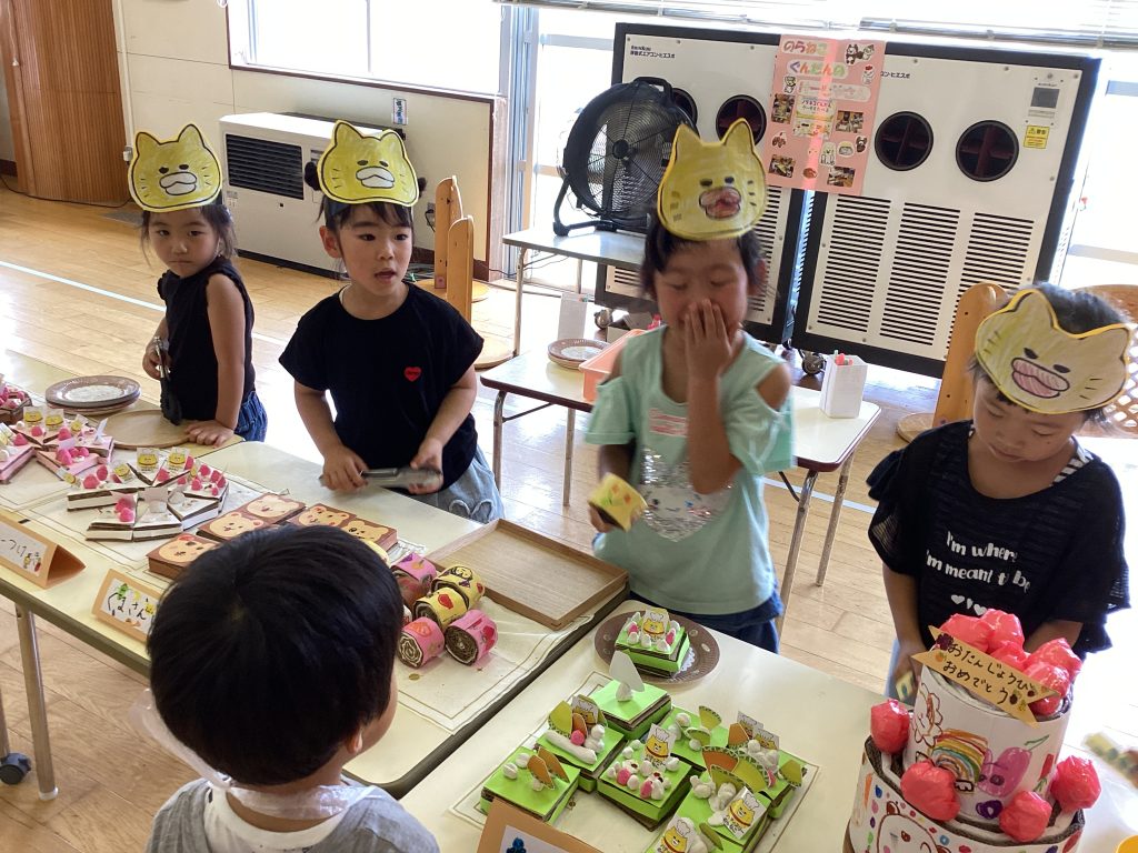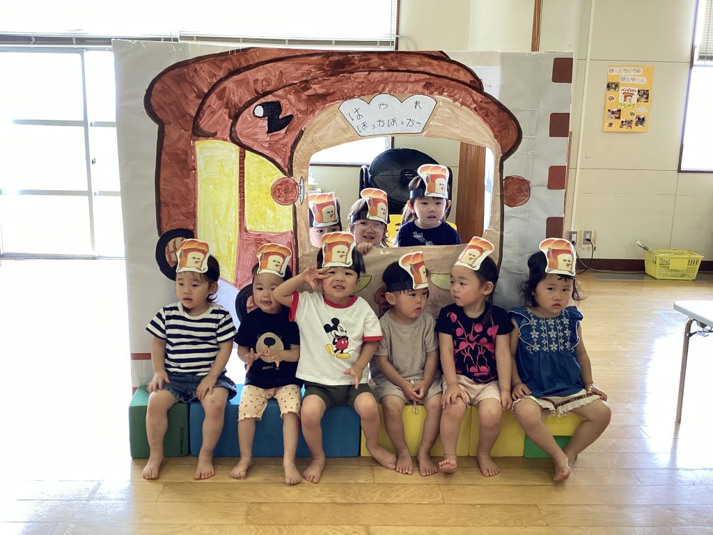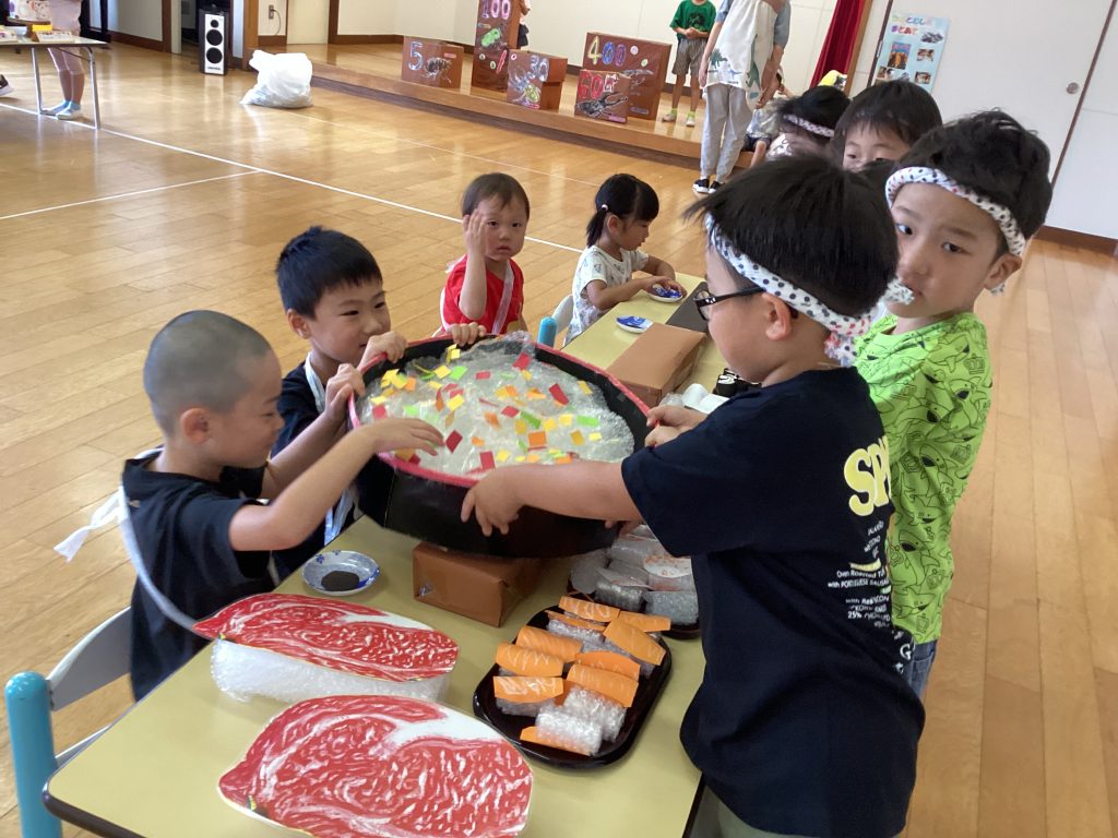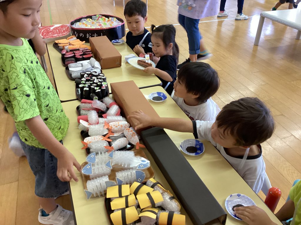 お遊戯室では「ぱんどろぼうのパン屋さん」「のらねこぐんだんのケーキ屋さん」「みんなのおすしのお寿司屋さん」「カブトムシの的当て」の4つの「絵本の世界」が広がっていました。