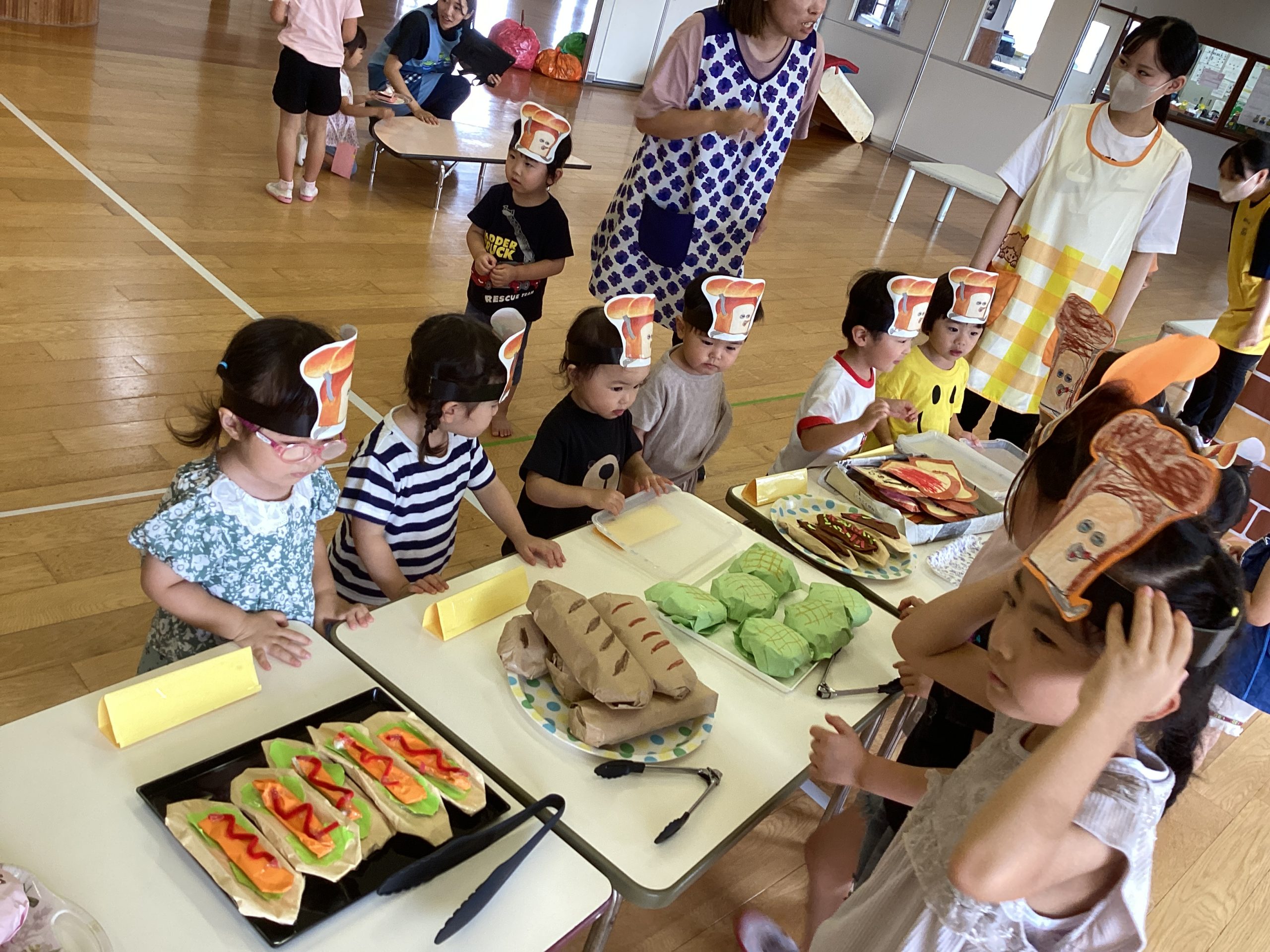お遊戯室では「ぱんどろぼうのパン屋さん」「のらねこぐんだんのケーキ屋さん」「みんなのおすしのお寿司屋さん」「カブトムシの的当て」の4つの「絵本の世界」が広がっていました。