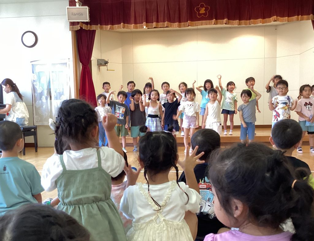 先生たちの出し物の前には、ぶどう組さんが「にじ」の歌を披露してくれました。素敵な歌声に一緒に口ずさむ子の姿も見られます。