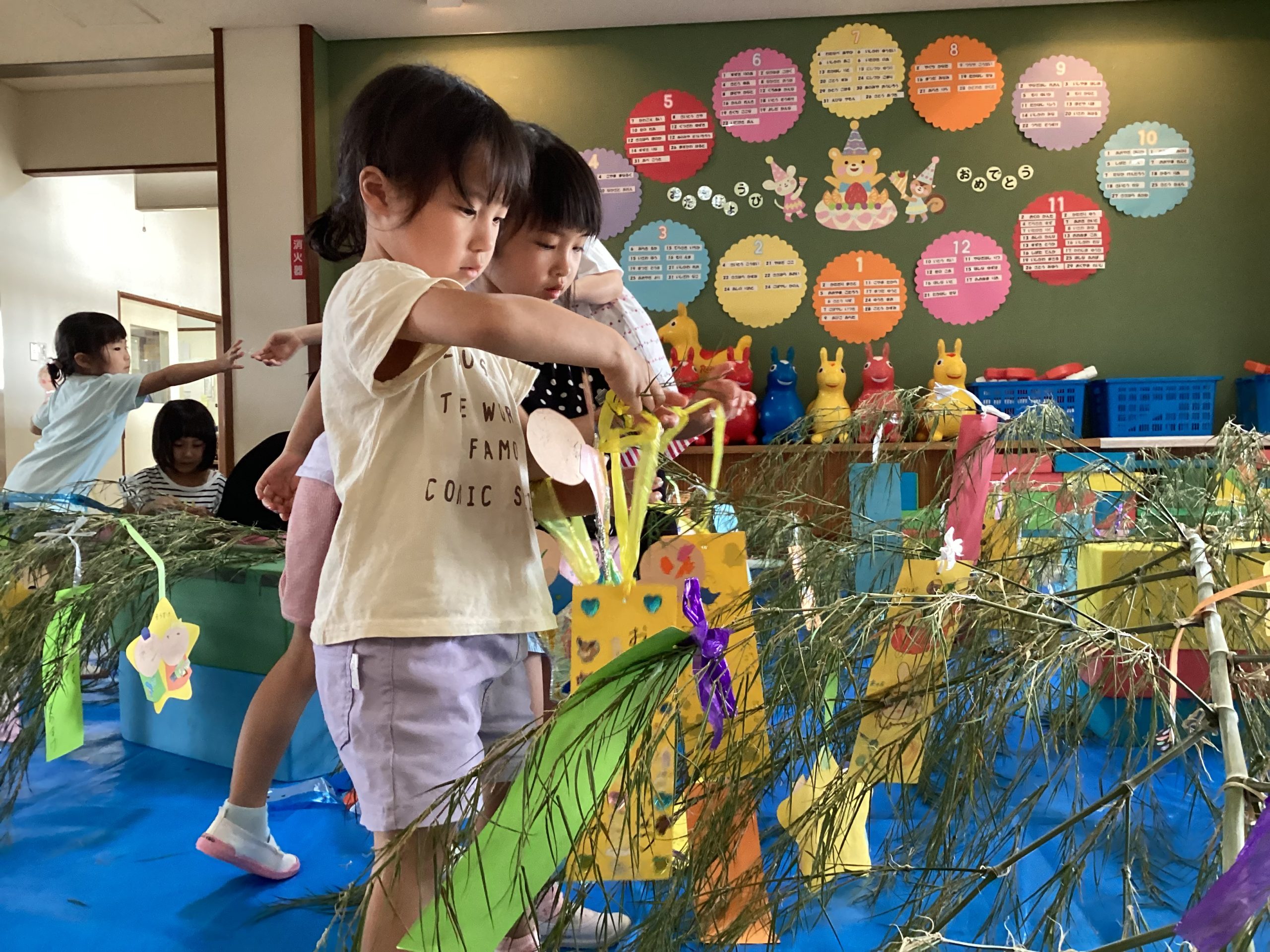 こども園の玄関には今年も、子どもたちが楽しく作った笹飾りと、おうちの人と願い事を書いた短冊をつるした大きな笹竹が登場しました!