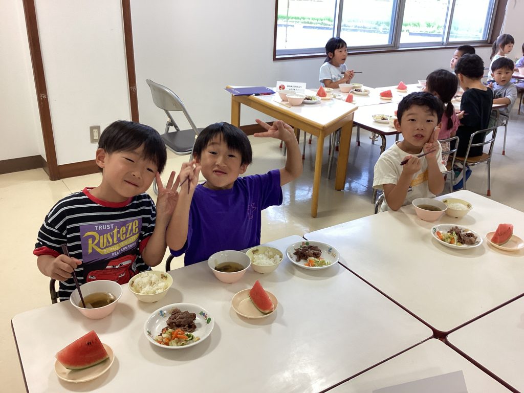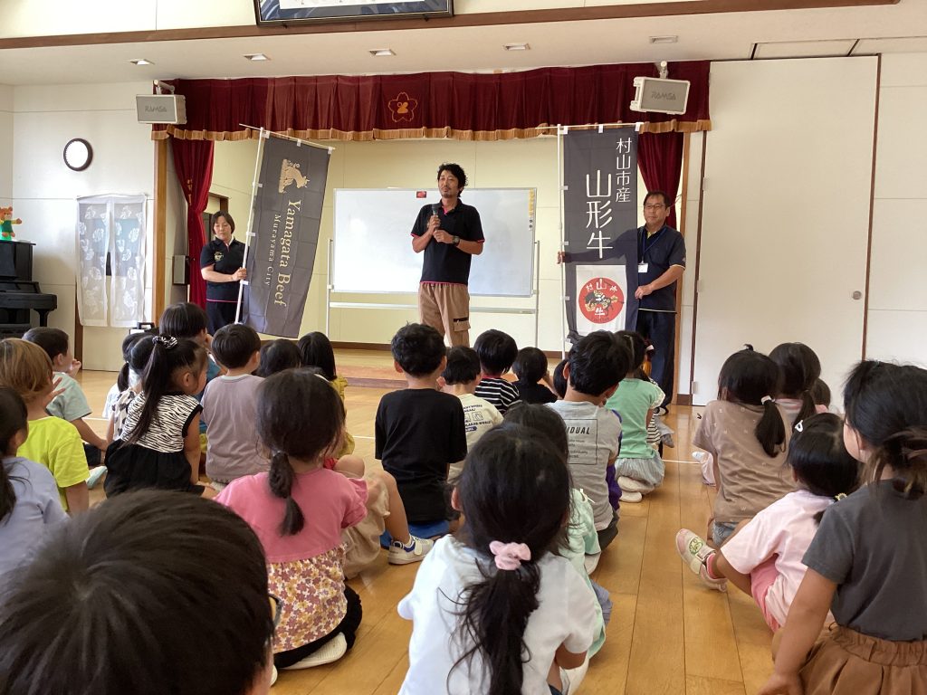 今日は、昨年に引き続き、こども園の保護者で山形牛生産者の小山さんご夫妻と、山形牛ファンクラブの皆様のご協力のもと、「村山産山形牛ランチ給食」が行われました。