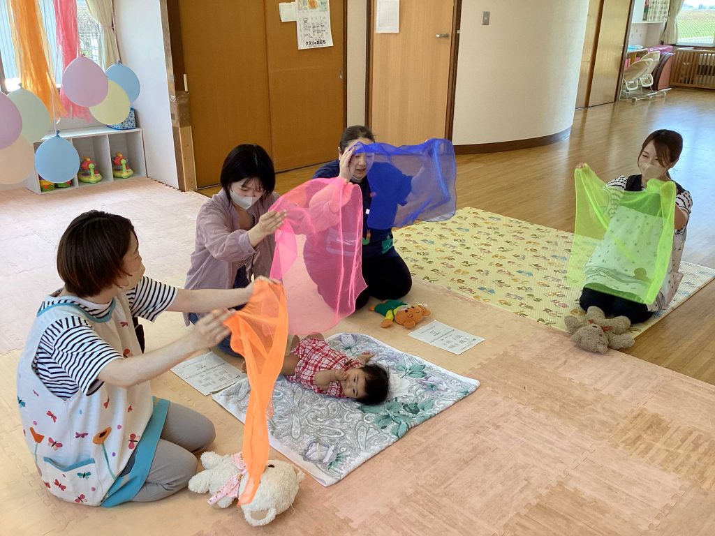 ミニとまと組(0歳児)のお友達は、お家の人とふれあいながら、わらべ歌に合わせ浮遊スカーフを使って遊びました。