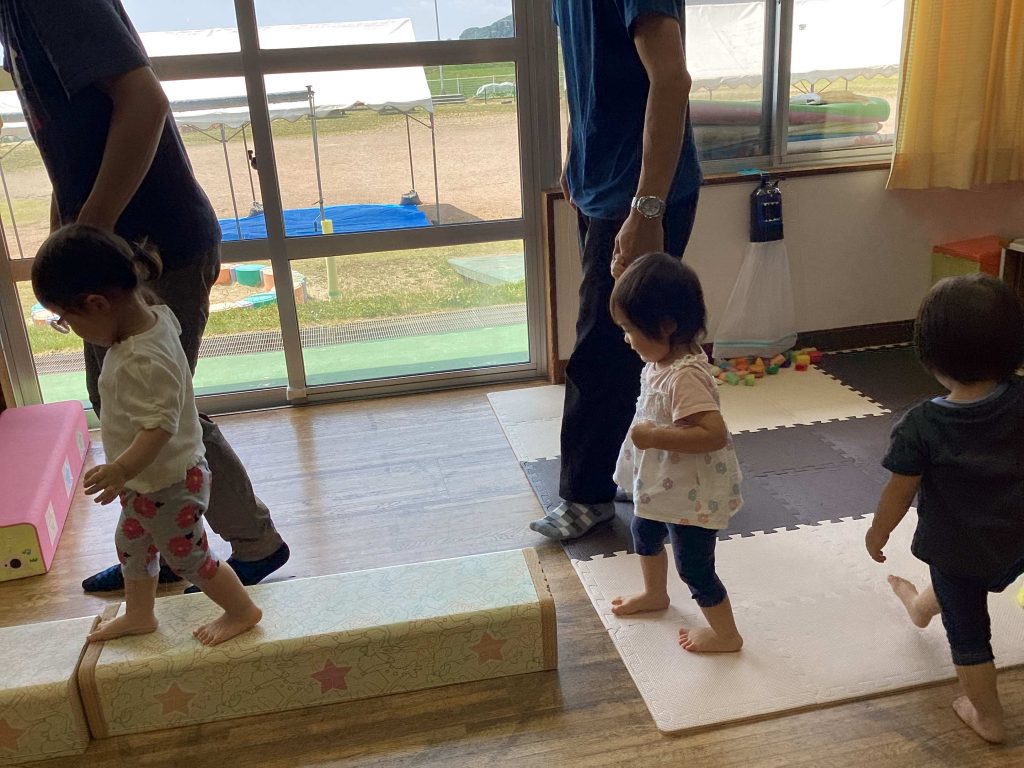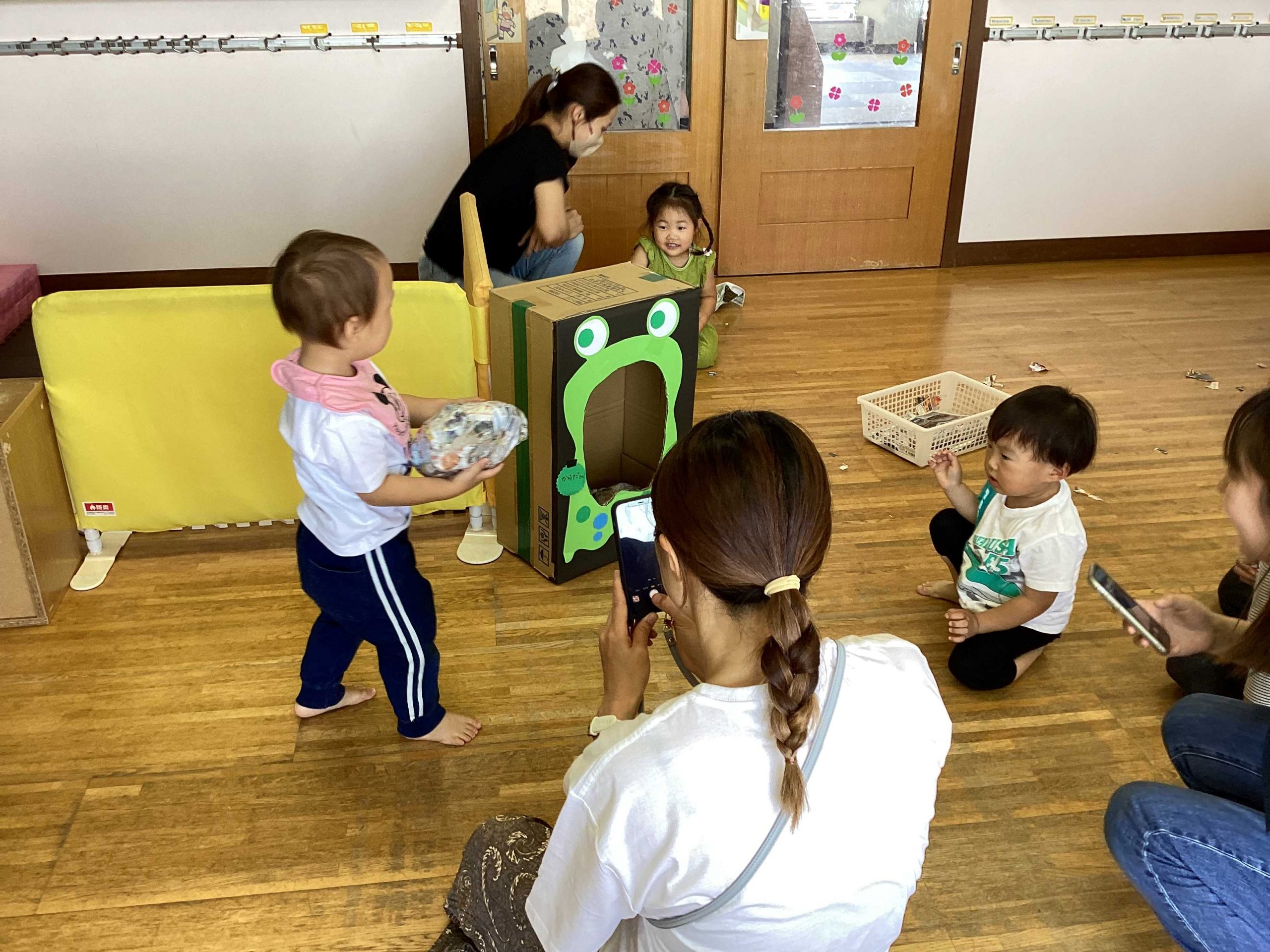 れもん組さんは、手遊びや大型絵本をみました。そのあとは、ふれあい遊び『親子で動物まねっこリレー』です。