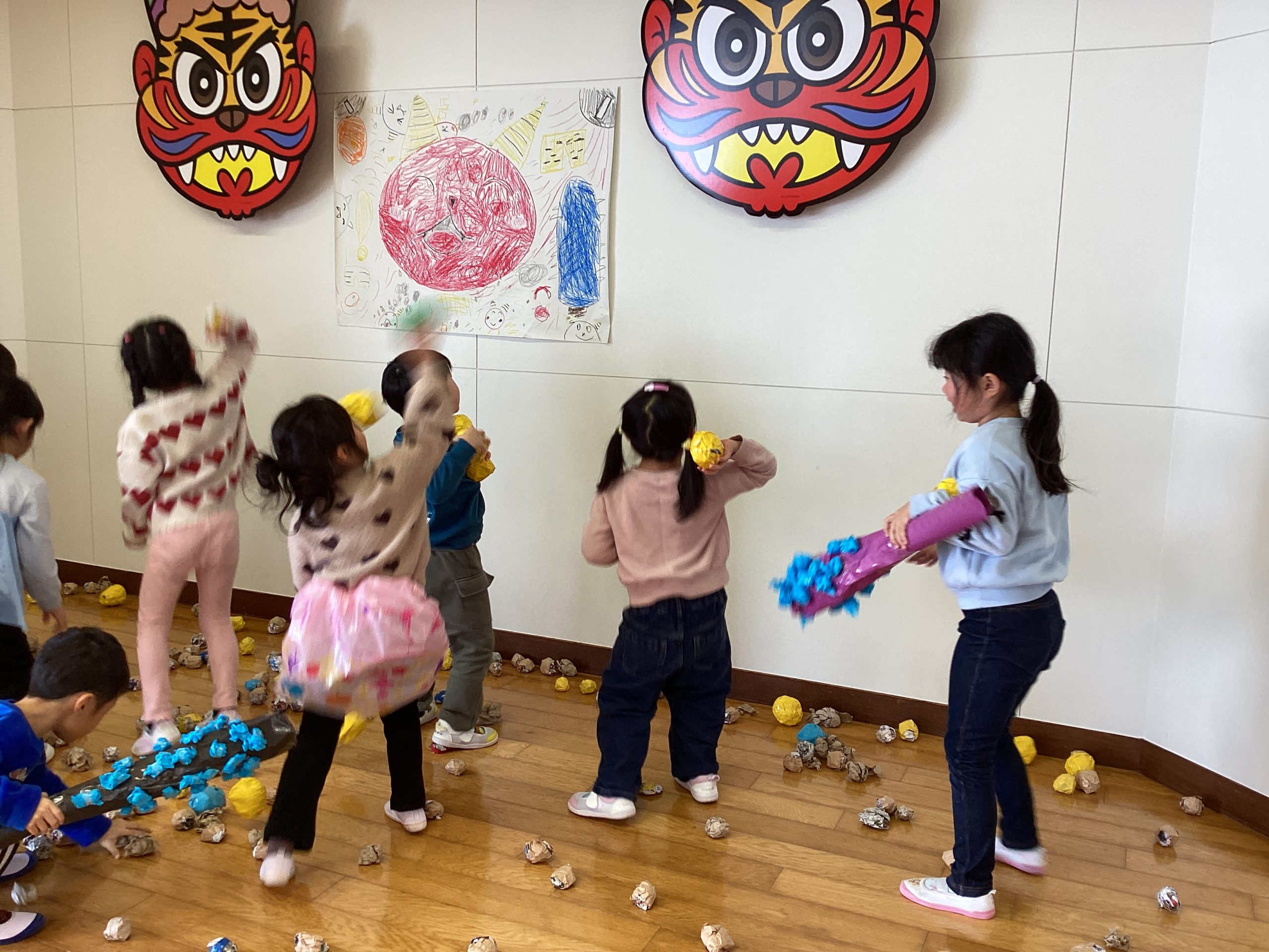 会終了後も自分たちで作ったお面や武器を身につけて、力強い「鬼は〜そと!福は〜うち!」のかけ声で元気いっぱい豆を投げた子どもたちです!