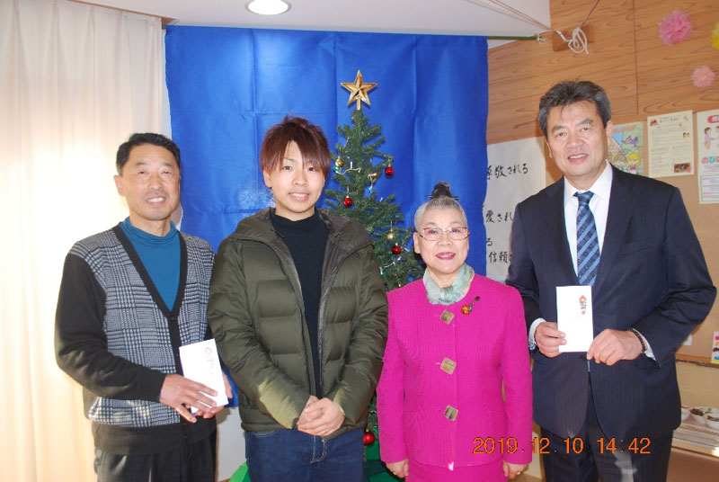 2019年12月11日 / 最終更新日 : 2020年3月28日 kei-kai1 園ブログ 寄付ありがとうございます。 令和元年12月11日、パフォーマーたつみ氏が園を訪れ寄附金を手渡して下さいました。たつみ氏は尾花沢市出身の大道芸人で、本業(会社員)の傍ら県内全域で活動・ご活躍されています。十年来、保育園や幼稚園などへの寄附を継続、積極的に福祉活動をなさっておいでです。今年度は村山市、河北町を含む3市町を検討の結果、村山市戸沢保育園、かほくあいこども園と偶然にも当会の2園にお声掛け頂きました。寄附金はたつみ氏の意向で、遊具購入のために大切に使わせていただきます。ありがとうございました。 水野理事長が駆け付け記念撮影 戸沢保育園にて井上園長に贈呈されました